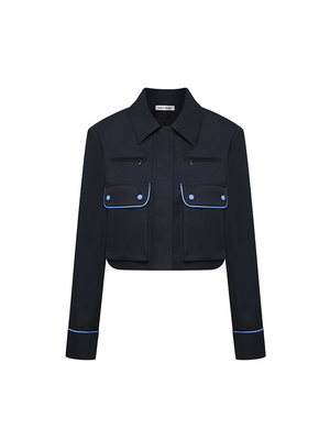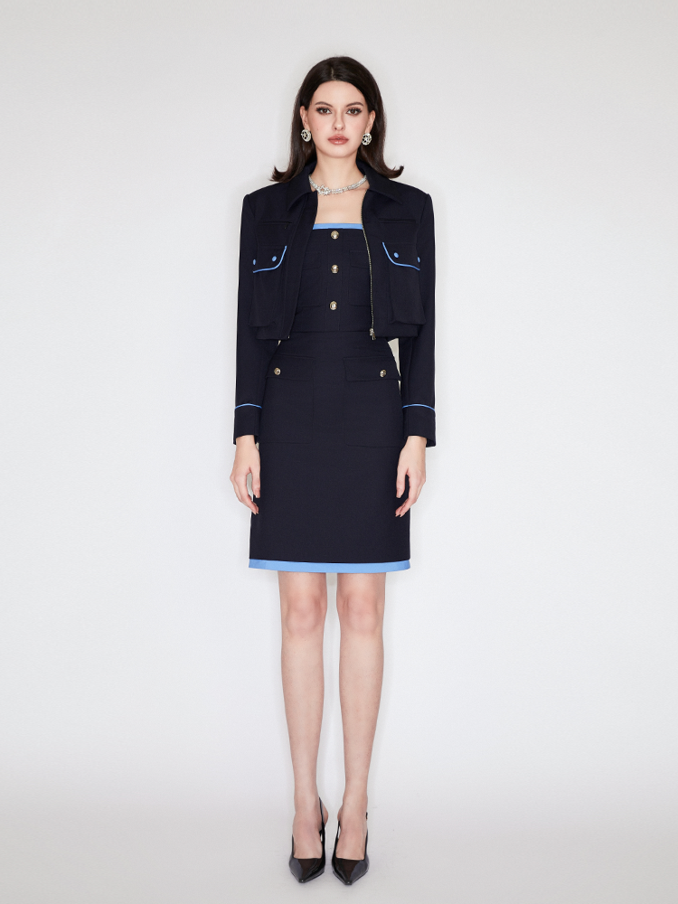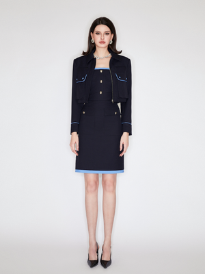 This jacket emphasizes the curves and proportions of the body. A color-blocking design embellishes the layers. A lapel design with a square-shoulder slim fit accentuates the vintage chic look. It can be paired with a dress from the same collection, ideal for everyday wear and parties. Pair it with the matching skirt for full impact.