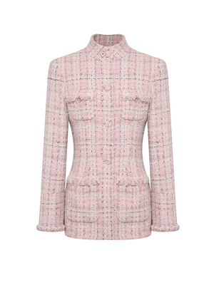 The pink tweed is soft and romantic. The stand-up collar enhances the neatness and sense of layering of the jacket, while the frayed edge details add a touch of retro fashion.