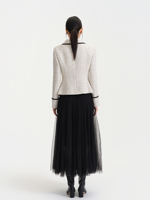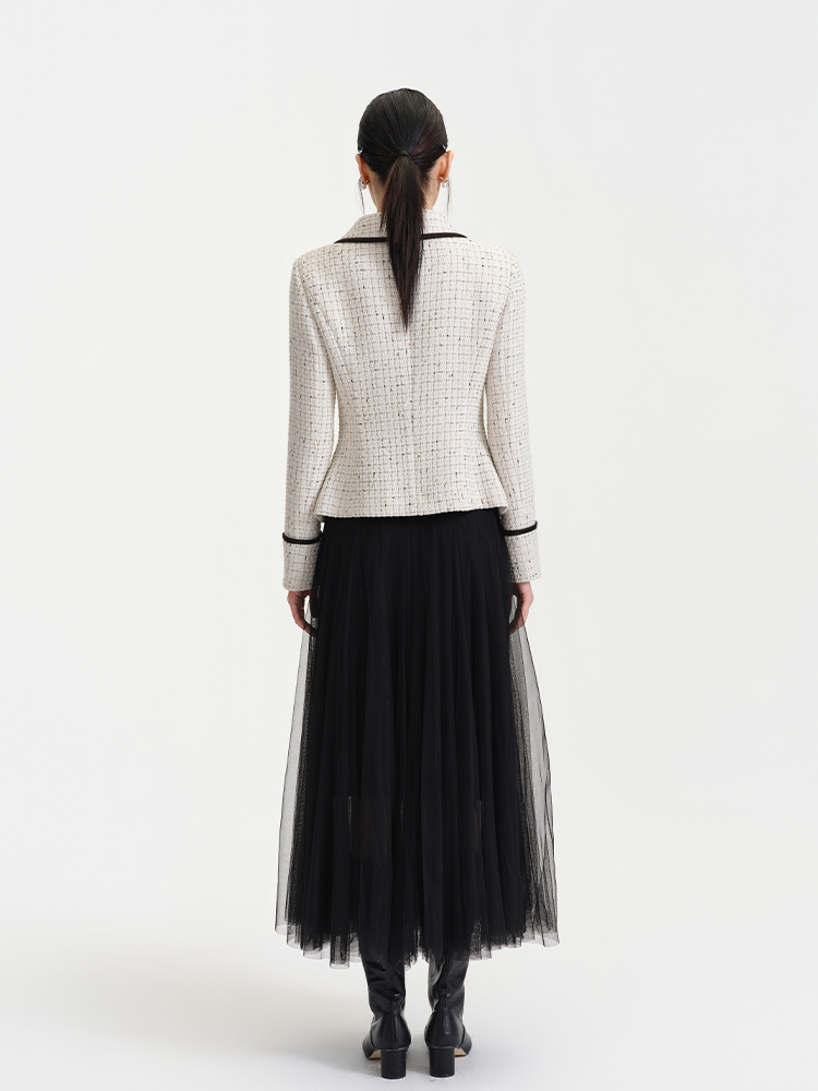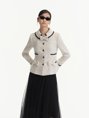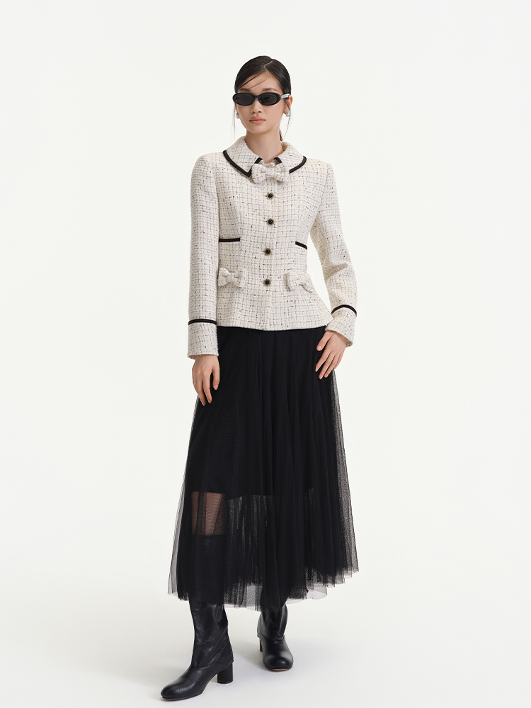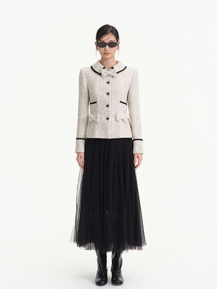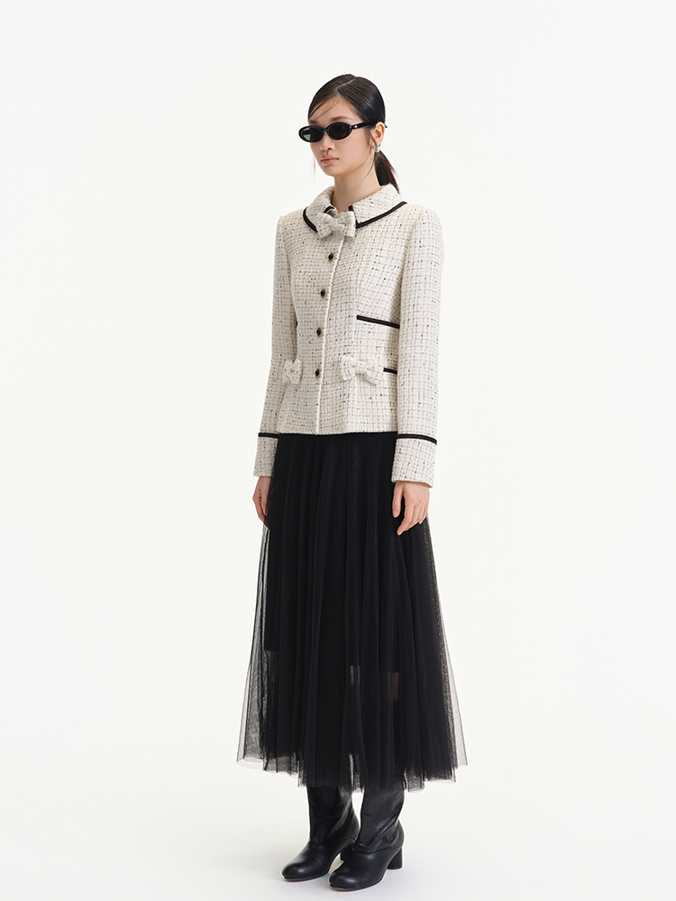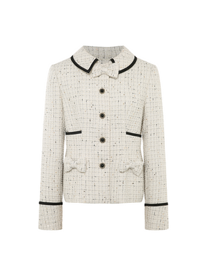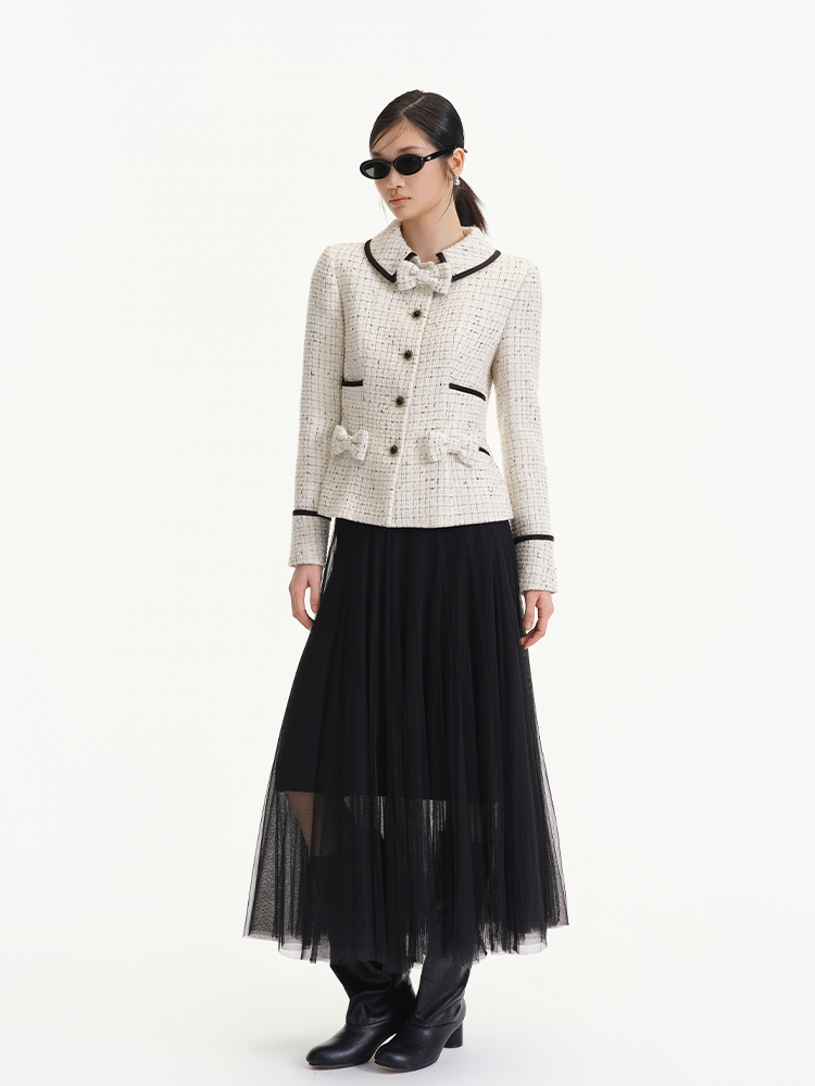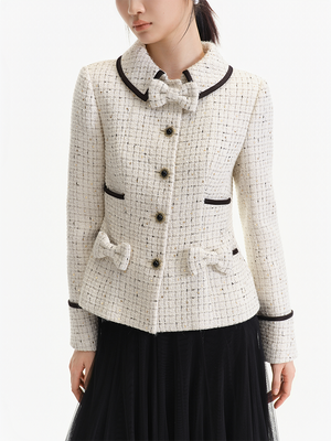 The light beige tweed is soft and classic. The black trim, bows and button designs are its highlights—the black trim enhances the jacket's neatness and sense of layering, while the bows add a sweet element.