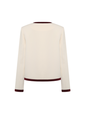 The pure white sets a fresh tone for the whole piece, while the burgundy piping adds a retro and luxurious vibe, creating a striking color contrast.