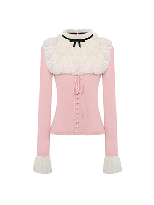 Pink And White Lace Ruffled Flare Sleeve Blouse