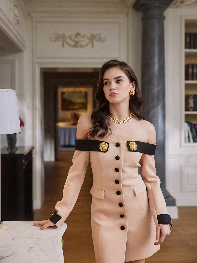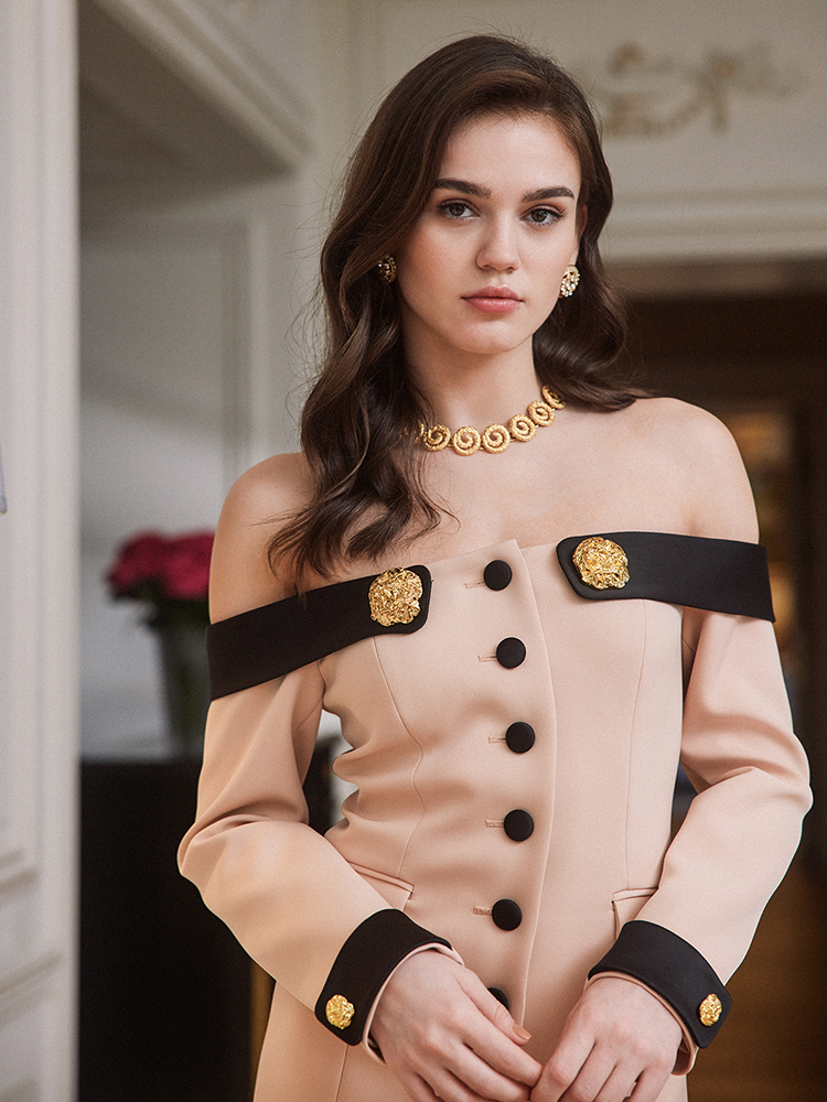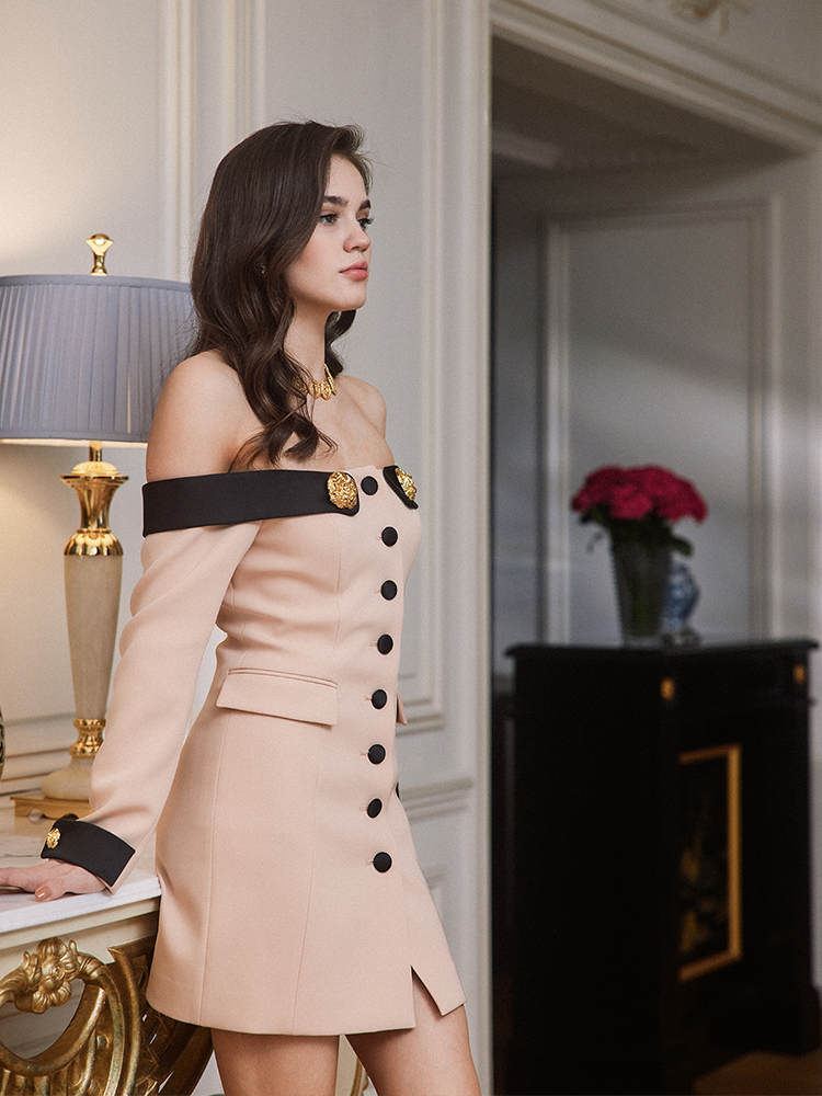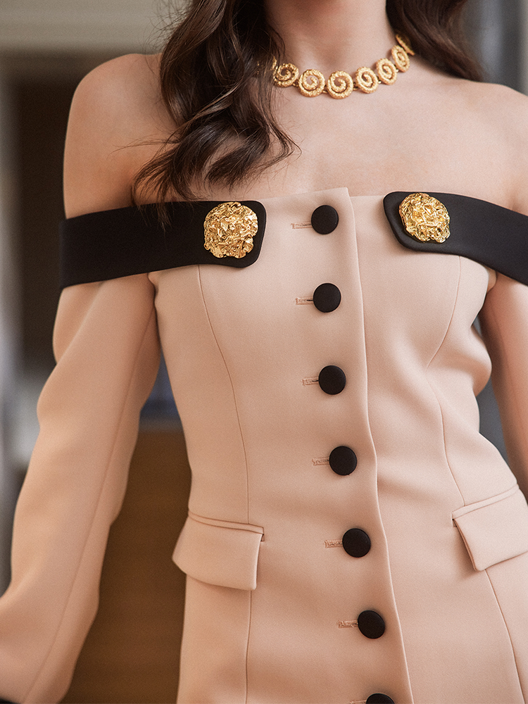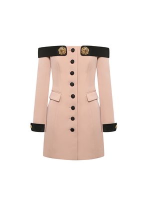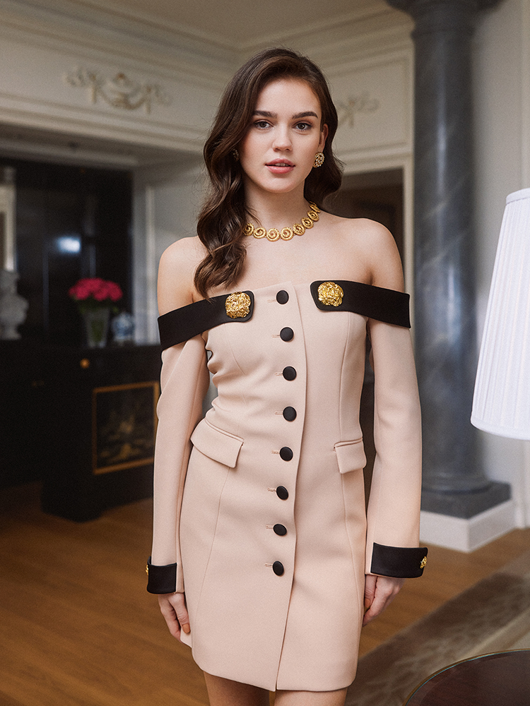 This dress features black and pink patchwork. It features a bold off-the-shoulder neckline that accentuates the attractive shoulder curves. The hemline is a fitted mini skirt that adds a playful touch. Slip on a pair of heels and wear with our branded statement earrings for a touch of elegance.