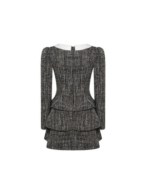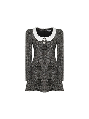 This tweed dress is well-made, soft, and warm. The classic Peter Pan collar is embellished with delicate rhinestone buttons, exuding a strong retro flavor. The hemline features a multi-layered design, adding a sense of hierarchy and three-dimensionality to the overall look. This outfit can be used for daily commuting or evening parties.