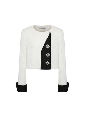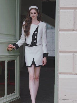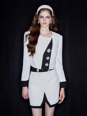 Timeless elegance in black and white. Exquisite rhinestone buttons add a touch of luxury to the overall look. The sharp silhouette flatters the figure, revealing a woman's competence and femininity. Whether you are in the workplace or at a social event, it's the perfect choice. Pair with the matching skirt and for full impact.