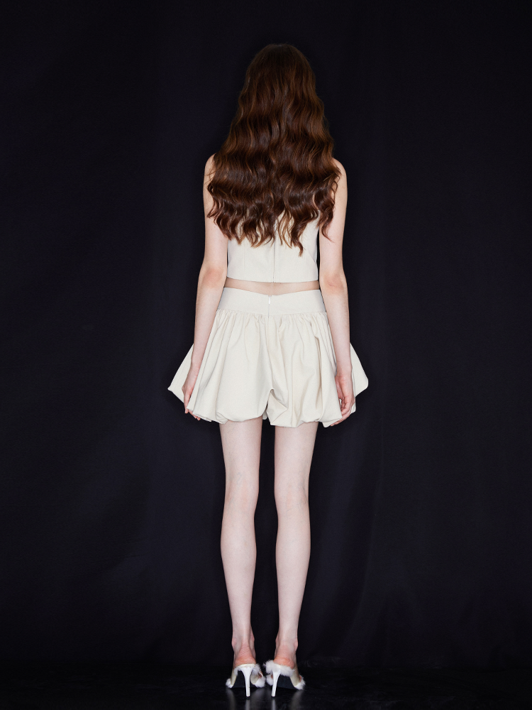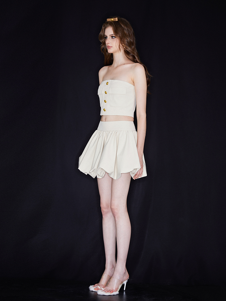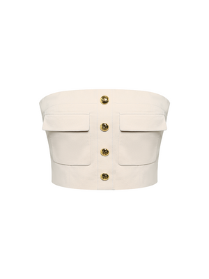 This off-the-shoulder top is beige. It is made of stiff and comfortable fabric. The strapless design reveals the beautiful shoulder and necklines. Embellished with double pocket details, it is elegant and handsome at the same time. It is a versatile piece. Pair it with the matching skirt for full impact.