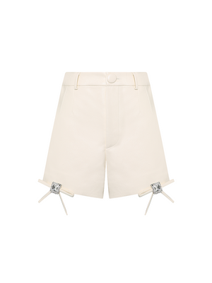 These shorts feature clean, flowing lines. Classic style cut. Embellished with a bow rhinestone button-up. Showing off a stylish and classic style. Feel free to mix and match with your choice of top.