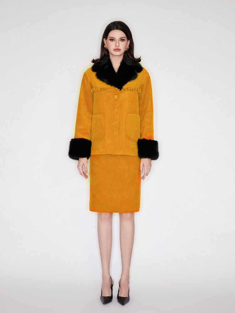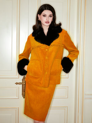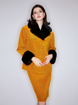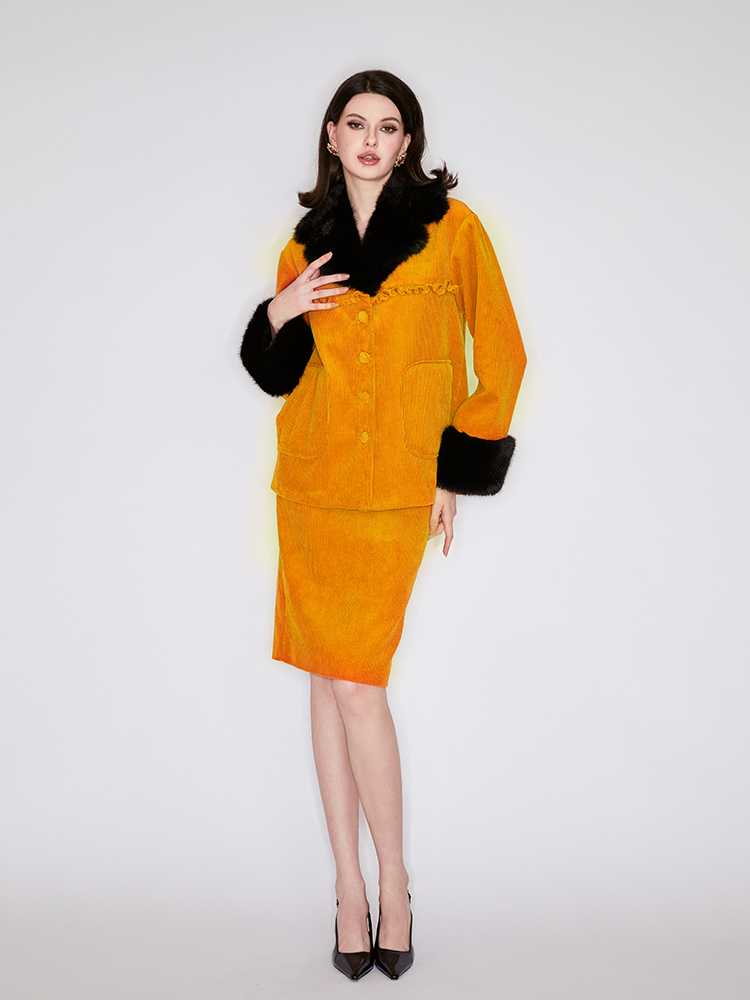 The orange color is full of vitality, and the black fur collar is luxurious and eye-catching, keeping you warm and elegant. Let you show your charm and confidence at the party or commute. Pair with the matching skirt and for full impact.