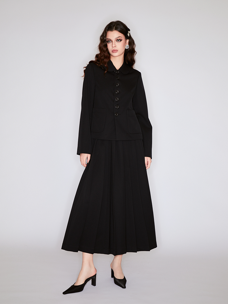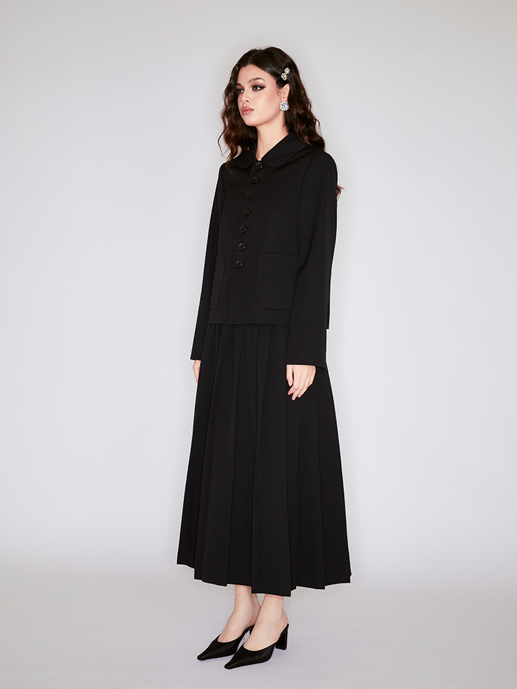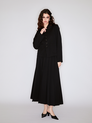 This black long dress is made of wool. The flowing pleats create a graceful movement as you walk, like a gentle breeze caressing. The black represents mystery and sophistication, suitable for various occasions. Pair with the matching jacket for full impact.
