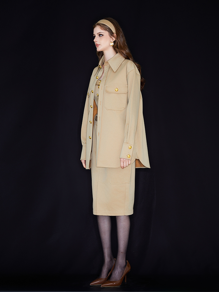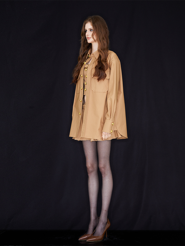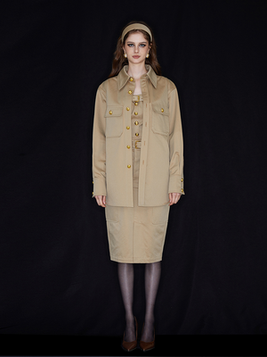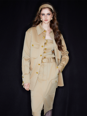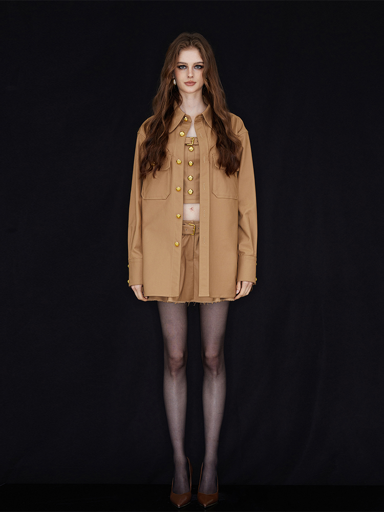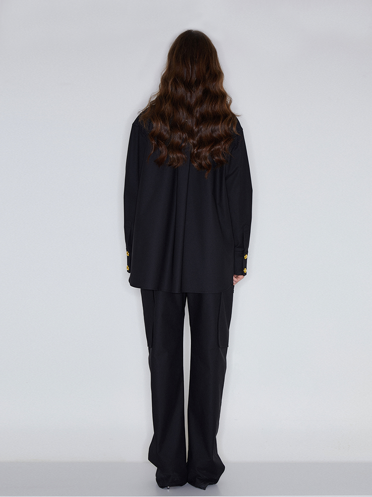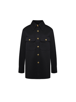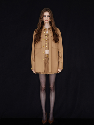 This oversized blouson is casual and comfortable and can be worn in a variety of ways. It is embellished with gold buttons for added sophistication. Pair it with the matching skirt for full impact.