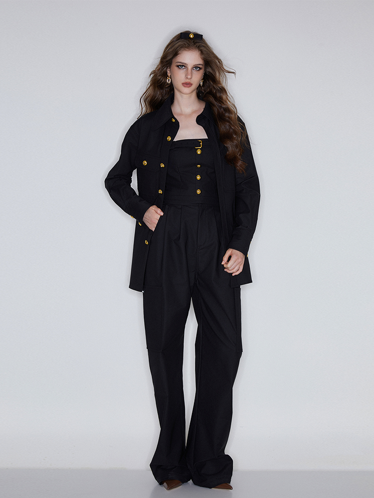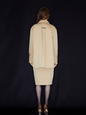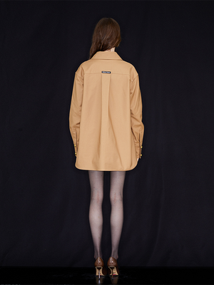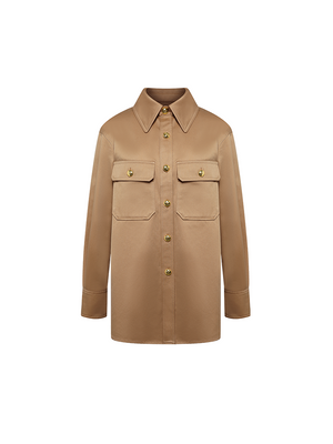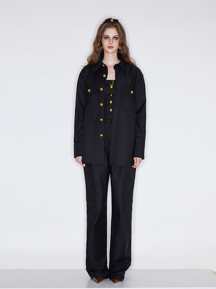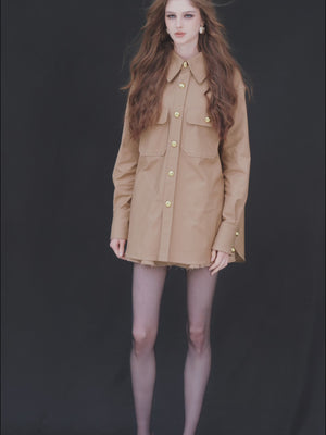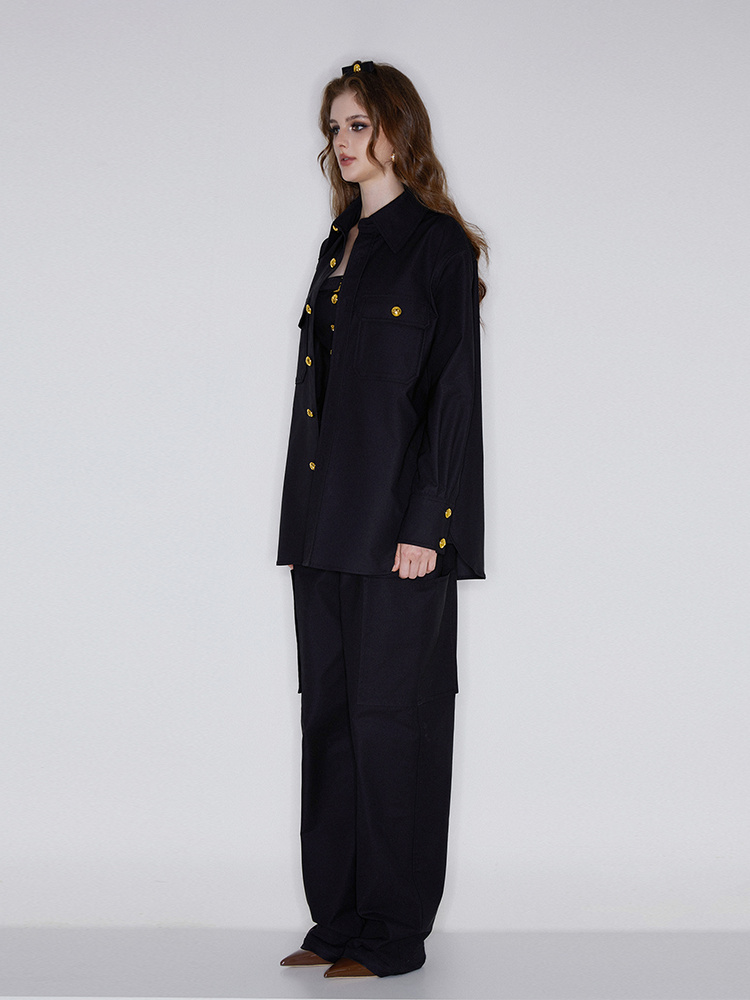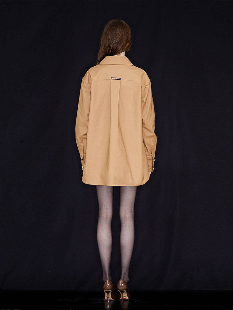 This oversized blouson is casual and comfortable and can be worn in a variety of ways. It is embellished with gold buttons for added sophistication. Pair it with the matching skirt for full impact.