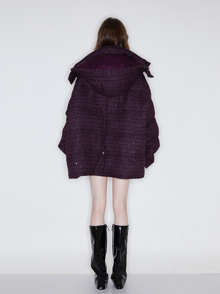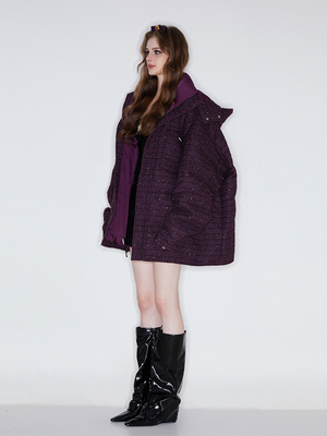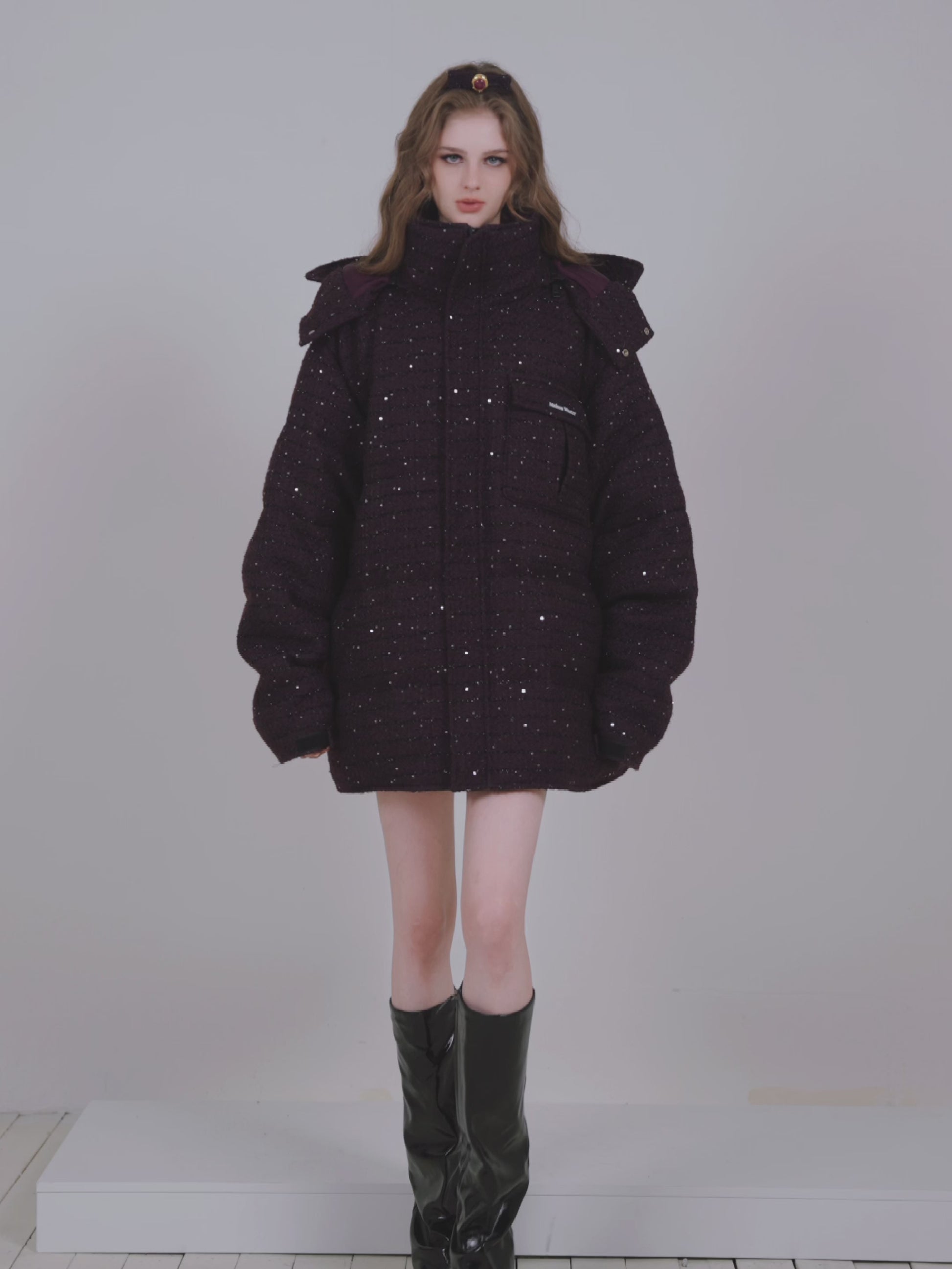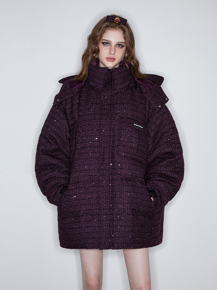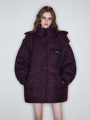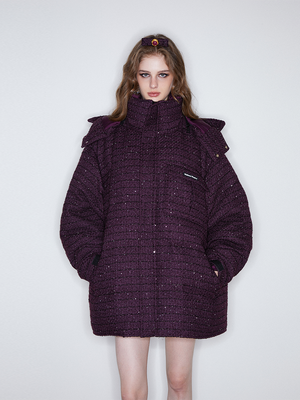 This is an oversized down jacket. It is made of tweed fabric. The fluffy and full white duck down will keep you wrapped in warmth this winter. It comes in an oversized fit, which increases the inclusiveness of the dress. It is a versatile item that is indispensable for your winter closet.