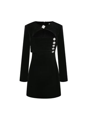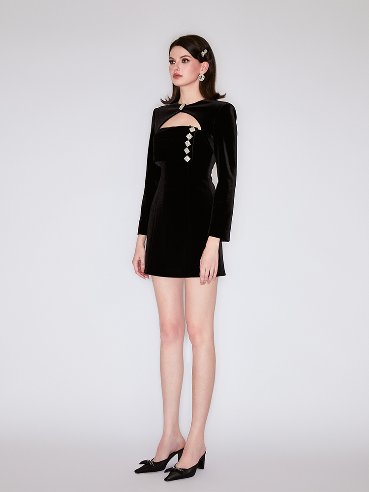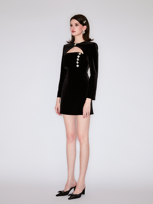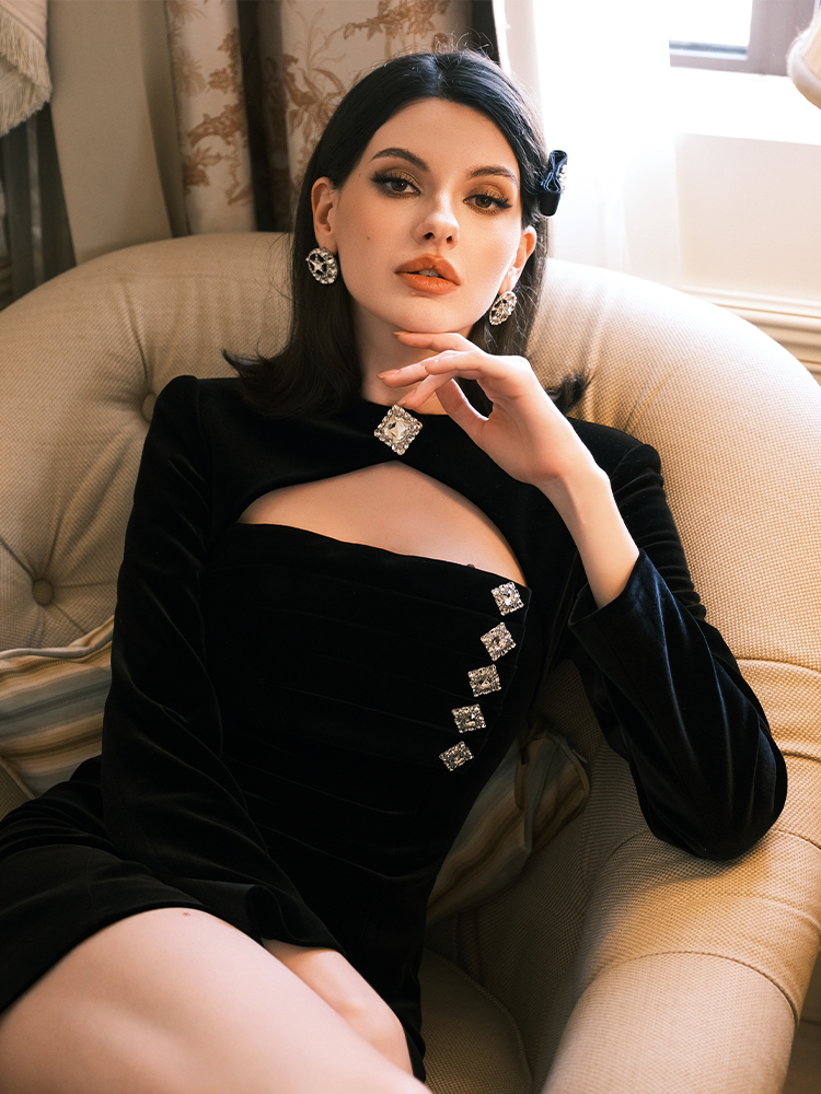 This velvet dress blend of elegance and luxury. The distinctive cut-out neckline shows off a sexy personality. Rhinestone buttons add a sense of splendor. The short, waist-cinching design elongates the leg line and creates a beautiful silhouette. Suitable for all occasions.