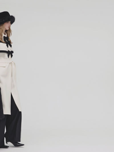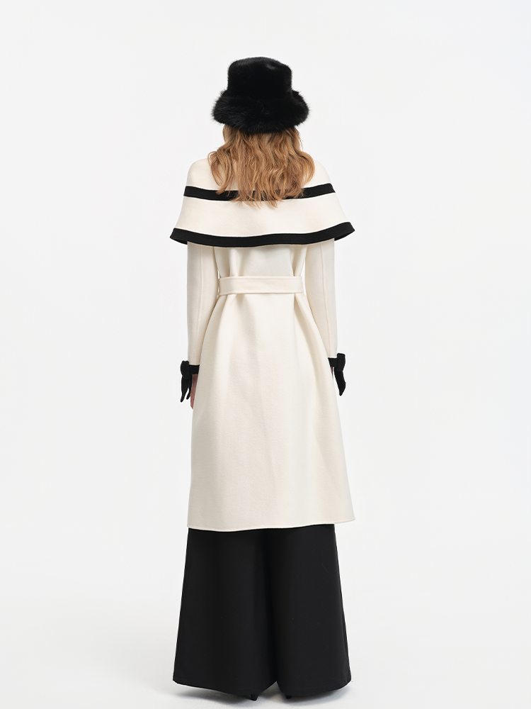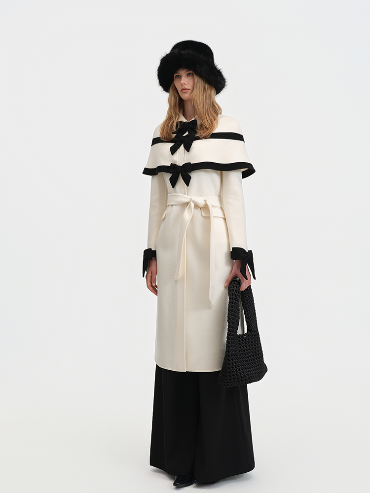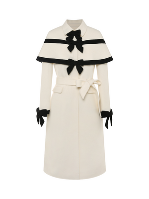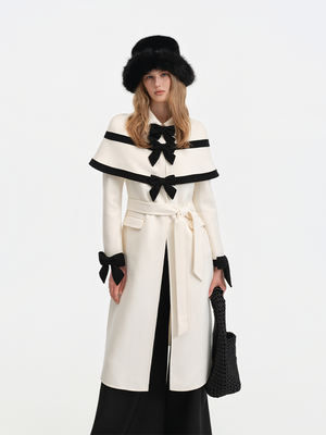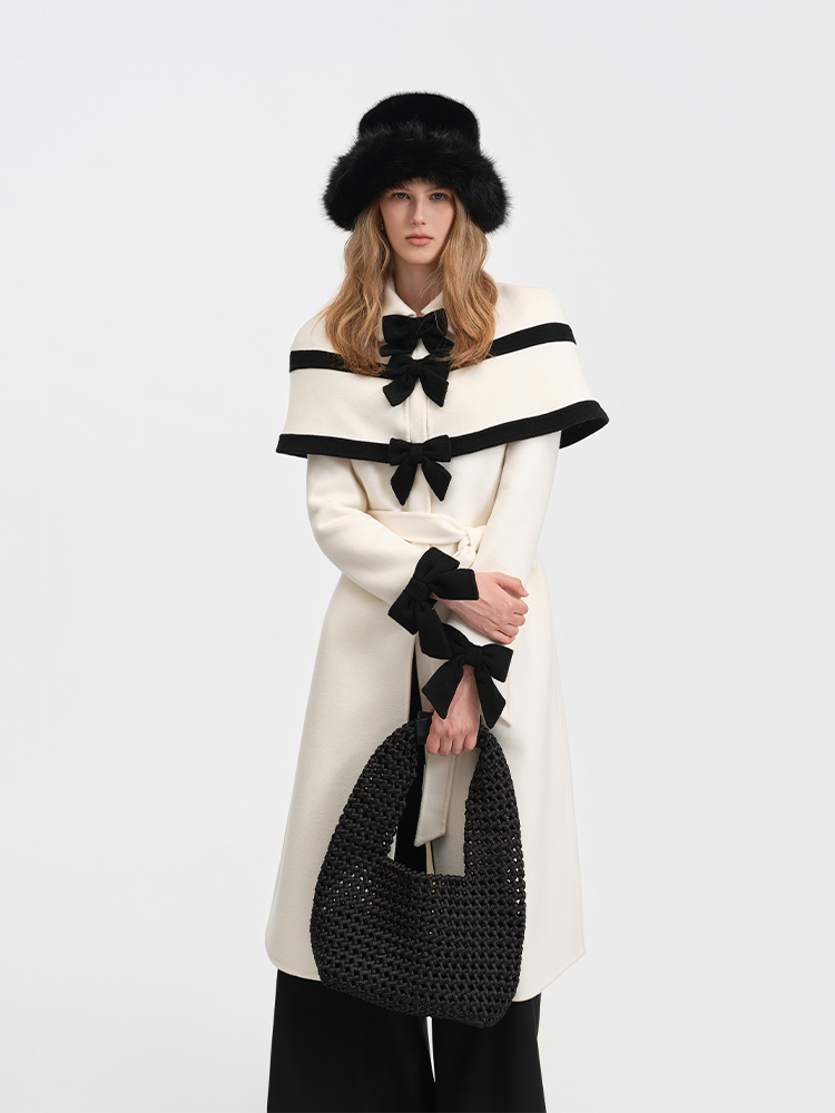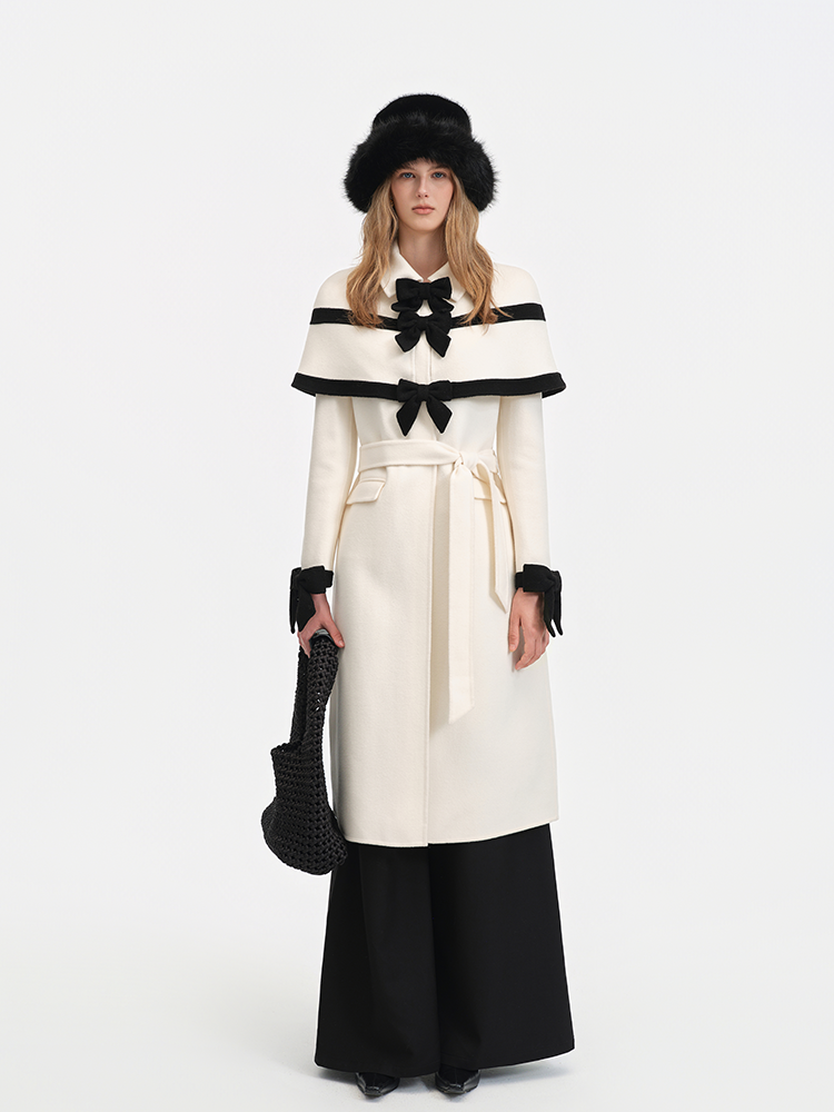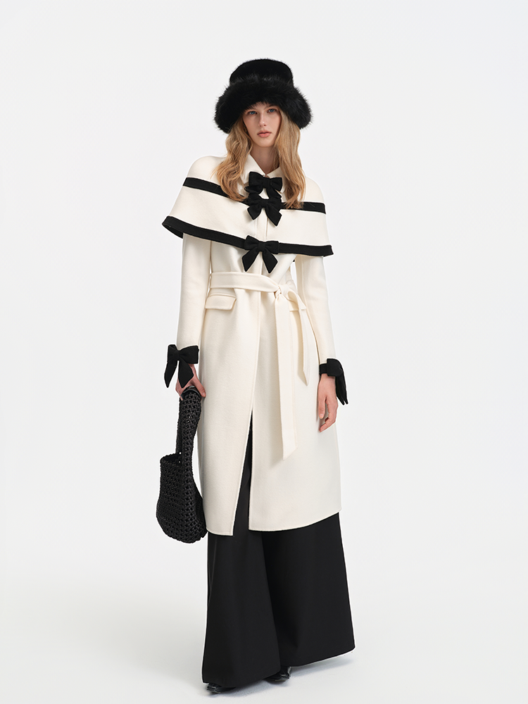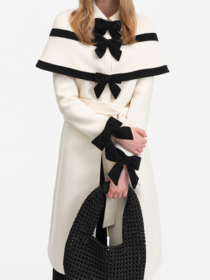 A15Black and White Velvet Bow Shawl Style Woolen Coat