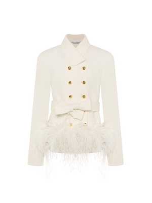 Crafted from imported Australian merino wool, the cream white hue exudes a clean and luxurious vibe. The double-breasted gold button design adds a retro and glamorous touch, while the feather trim at the hem stands out as a highlight, infusing the overall look with a sense of agility and elegance.