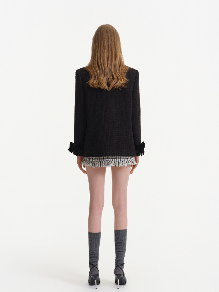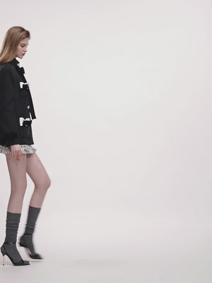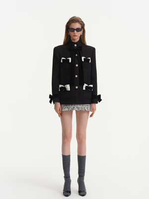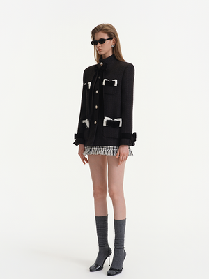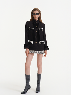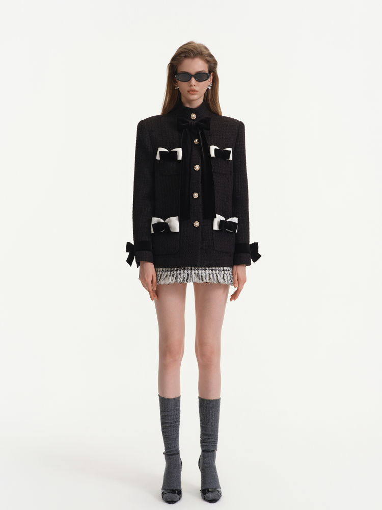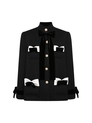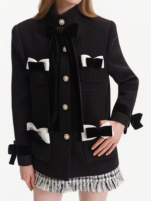 The contrasting color bow decorations, velvet elements, and stand-up collar design are its highlights. The contrasting color bows add sweet and eye-catching touches, the velvet material enhances a retro texture, and the stand up collar boosts the neatness and layering of the outfit.