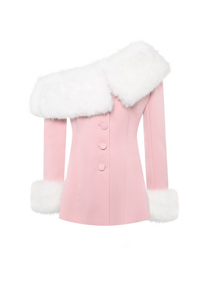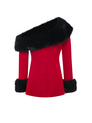 The unique one shoulder cut breaks the traditional symmetrical design, presenting an asymmetrical aesthetic and highlighting a sense of uniqueness and fashion. The black plush trim on the neckline and cuffs not only adds a warm feeling but also brings a luxurious and noble texture.