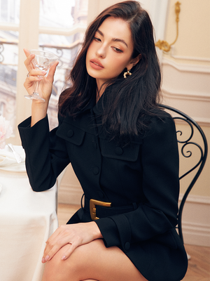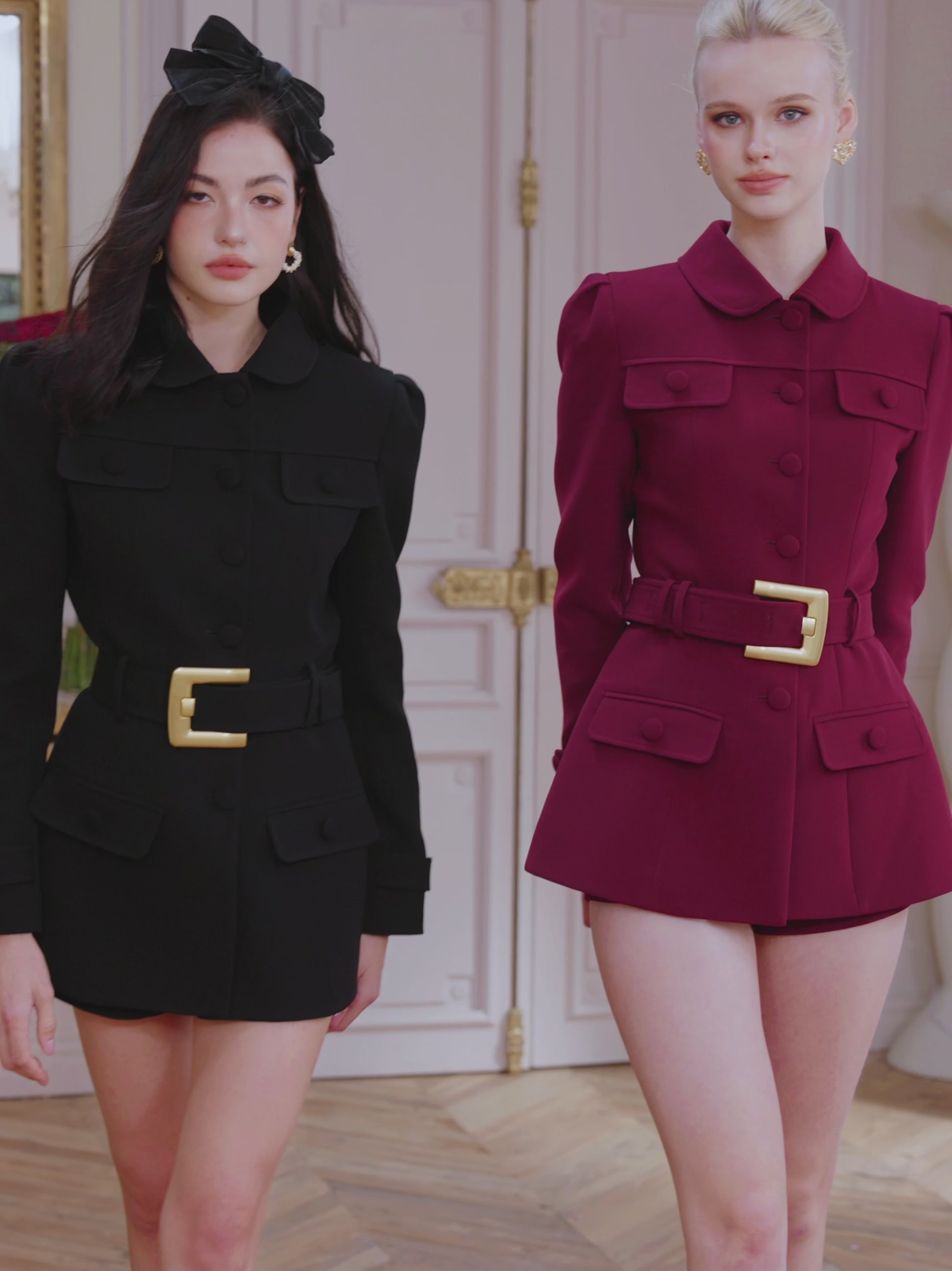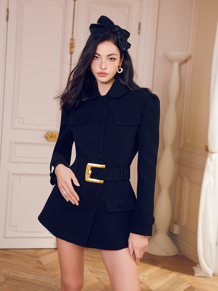 Classic lapel design combined with multi pocket elements retains the neatness and practicality of workwear style, showing a capable temperament. The waist cinching golden belt design is the finishing touch.