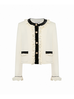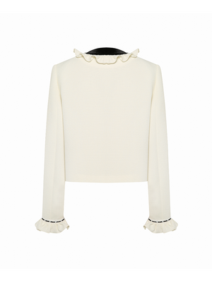 The black piping and white ruffled trim at the collar, placket, and pockets, through color contrast and soft ruffled edges.