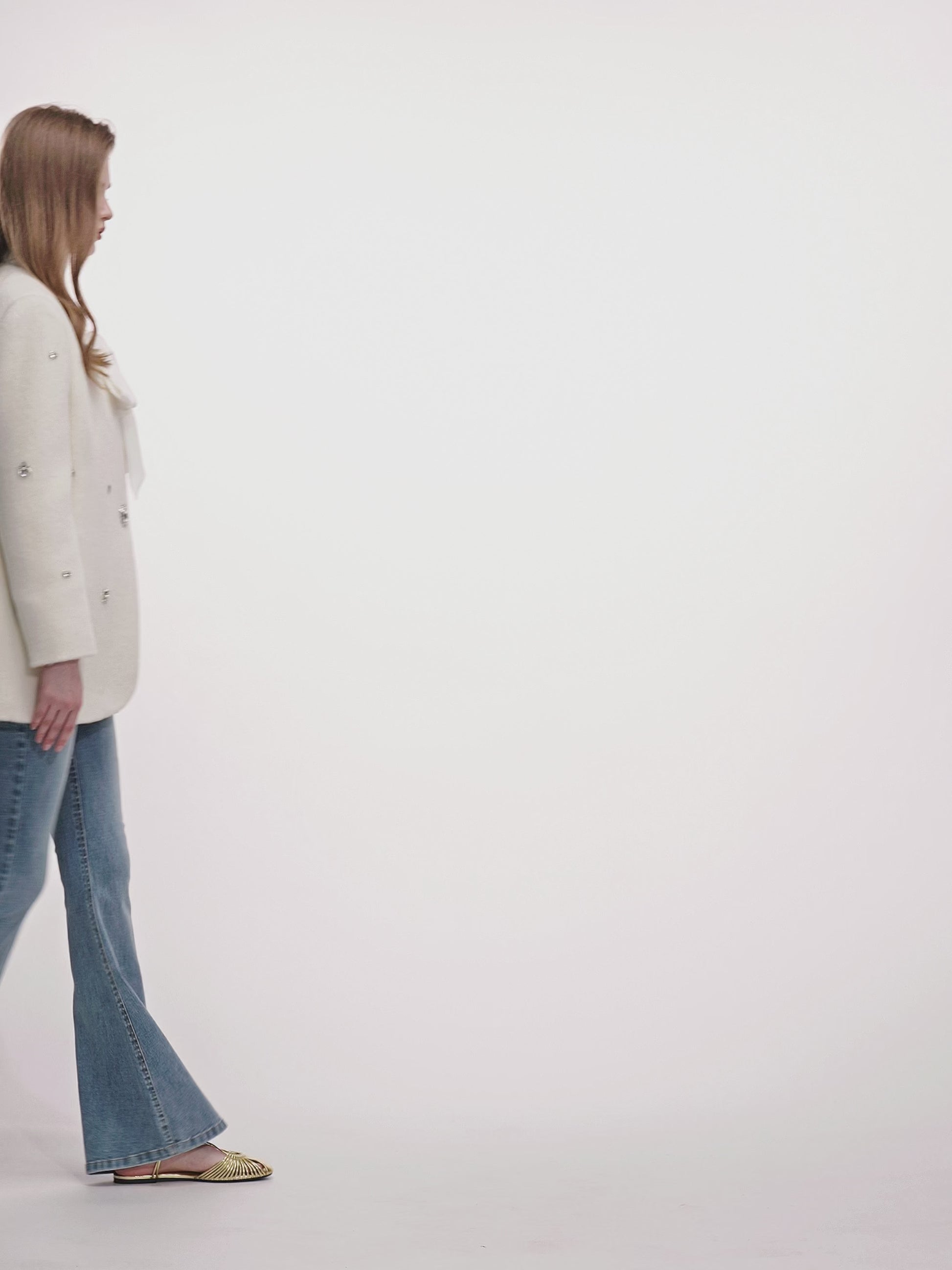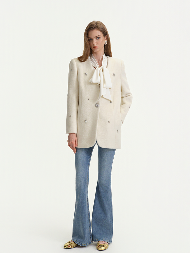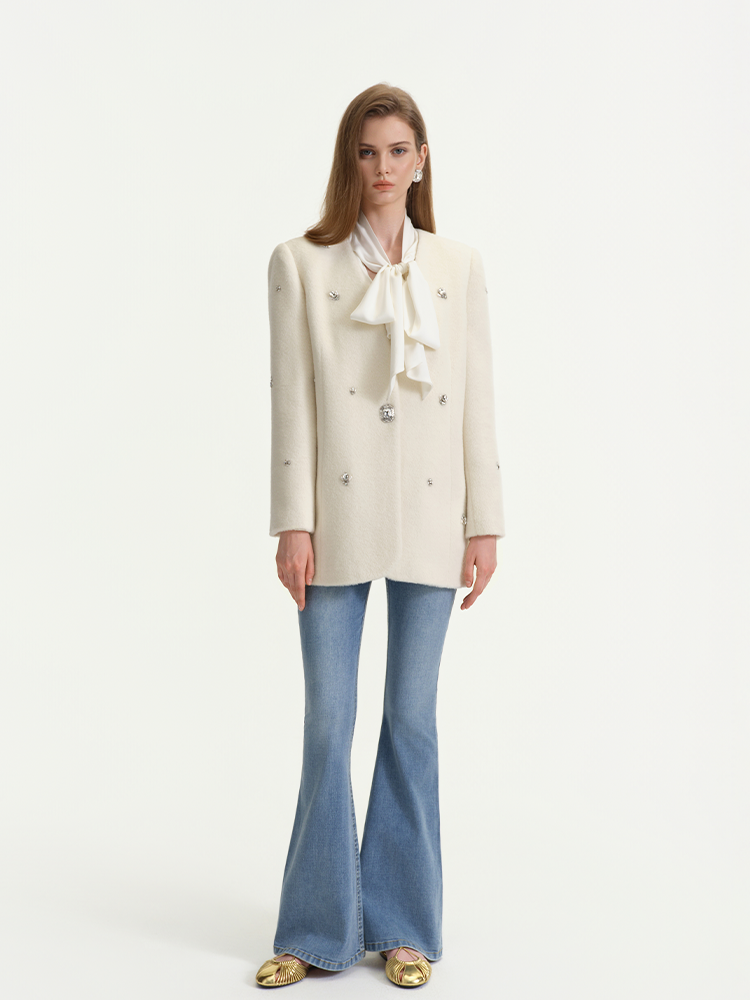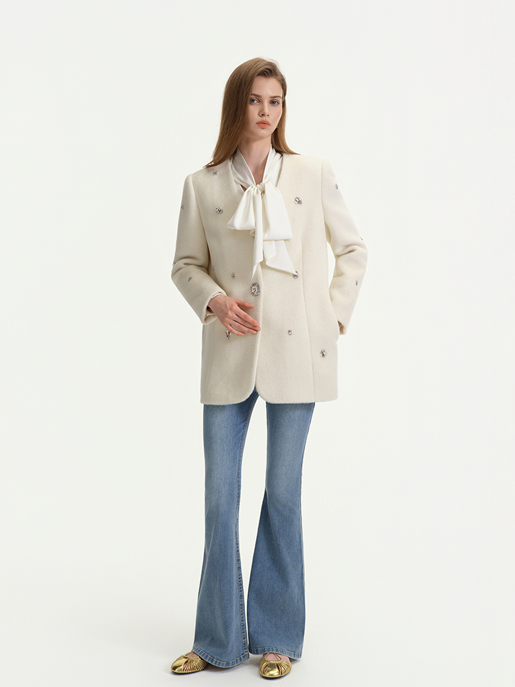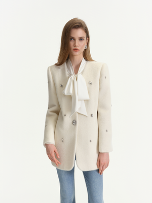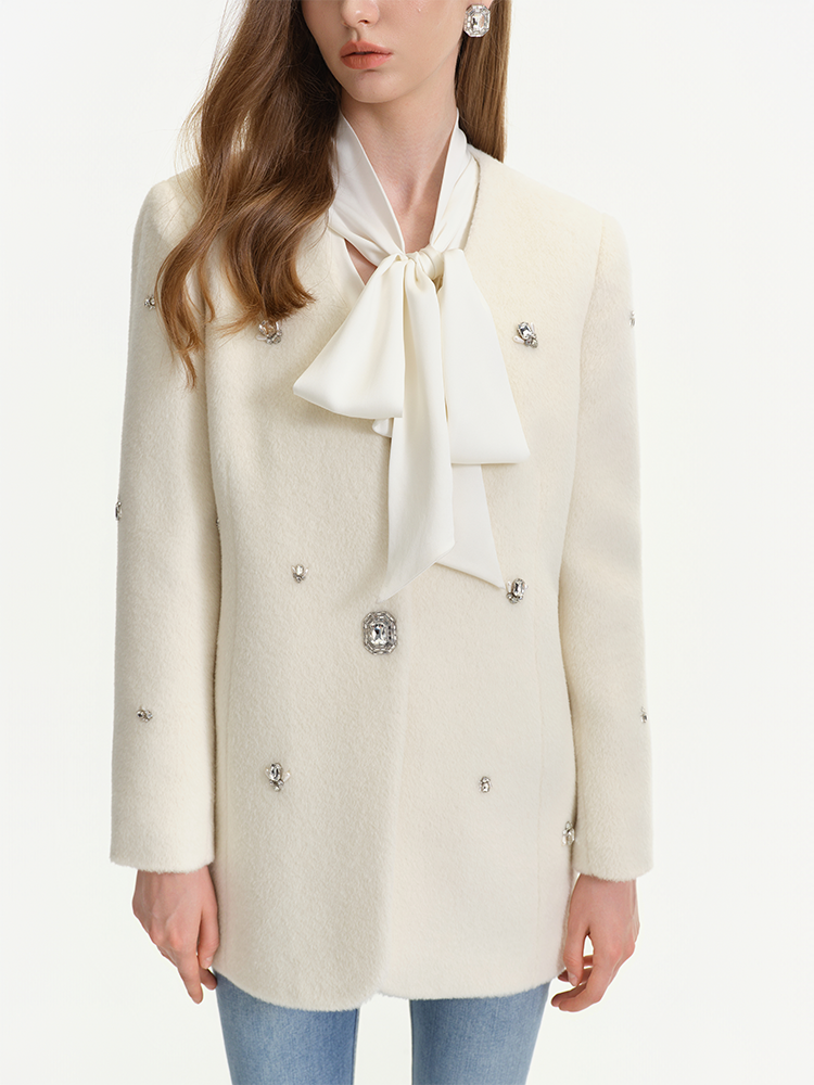 White is pure and soft, laying a high-end and gentle tone for the whole look. The all over rhinestone embellishments add rich visual layers and a sense of luxury.