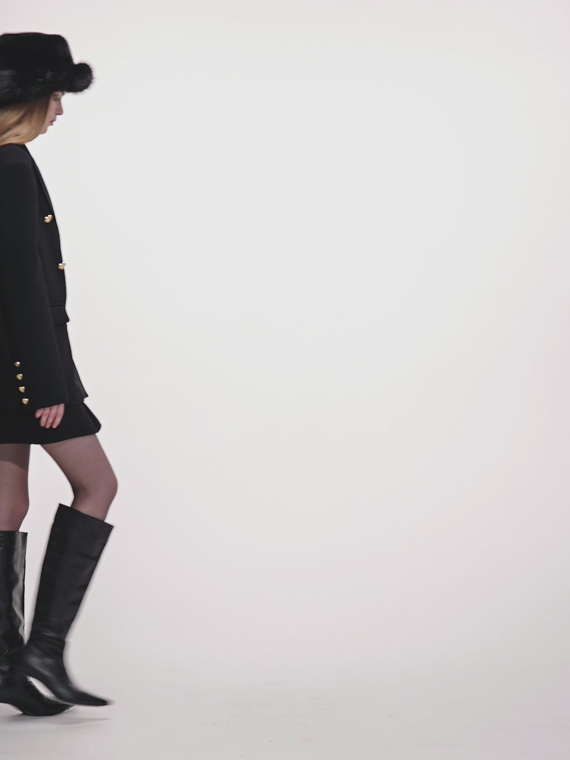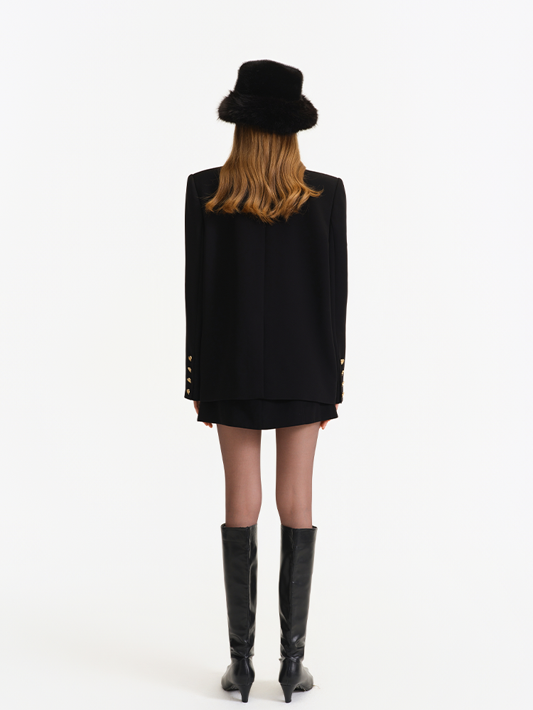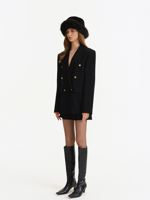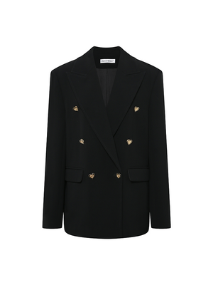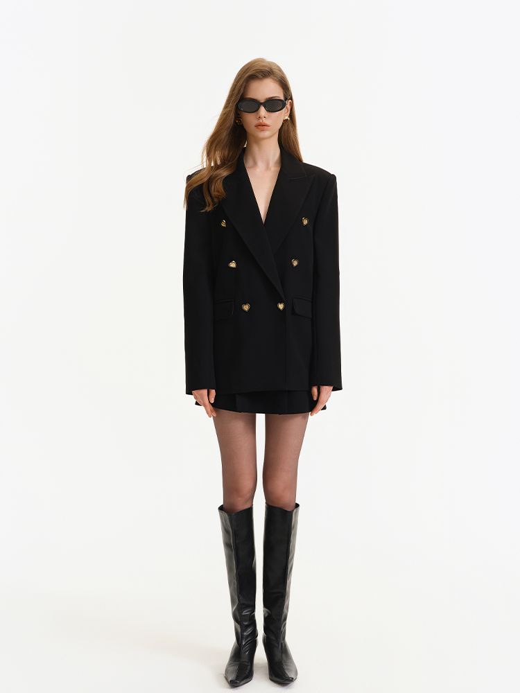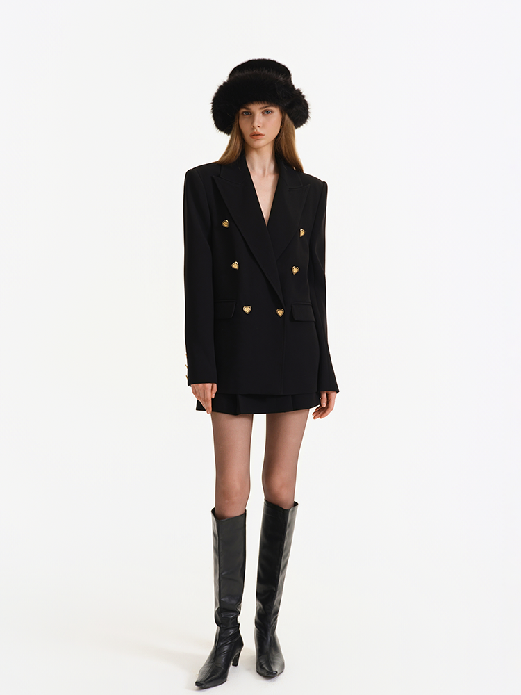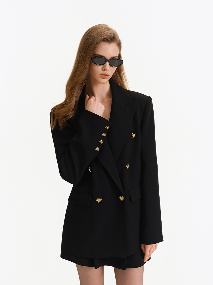It retains classic blazer elements such as double-breasted fastenings and peak lapels, while innovatively incorporating gold heart-shaped buttons. These buttons infuse the otherwise formal blazer with a romantic and playful charm, breaking the dullness of conventional blazers.