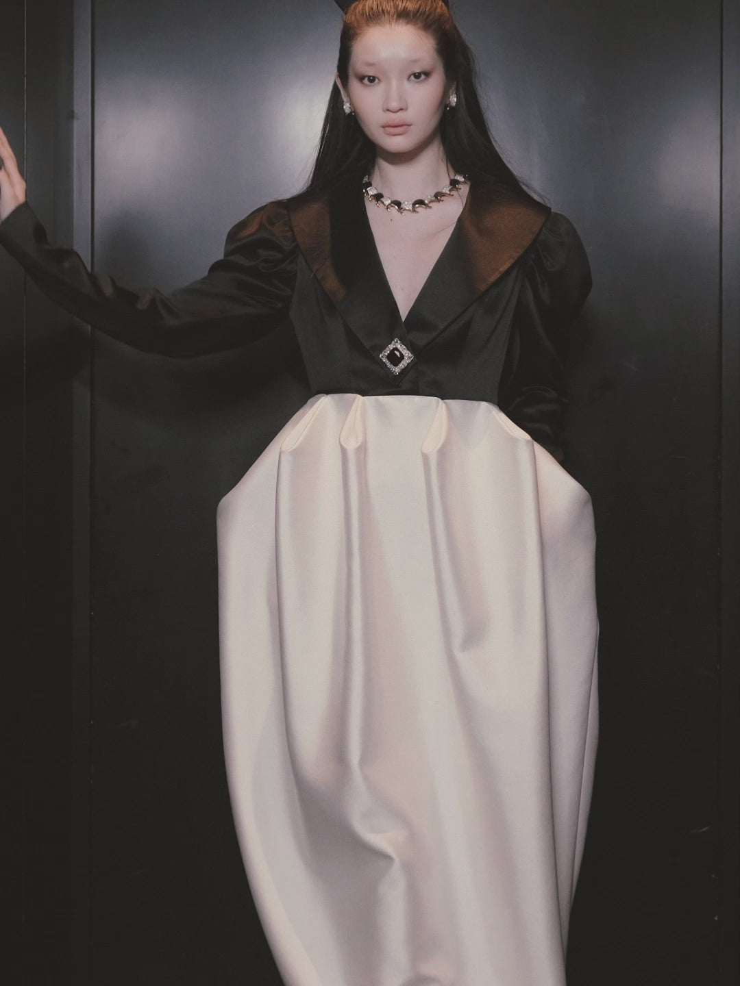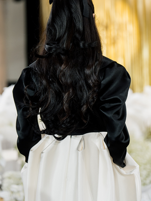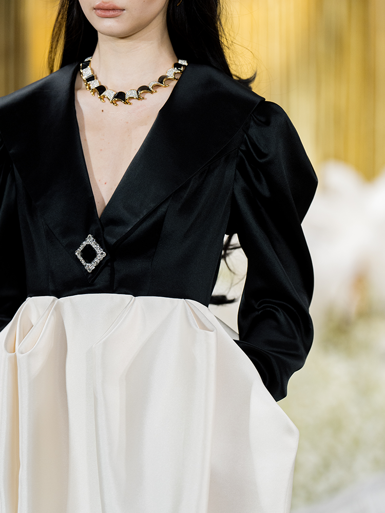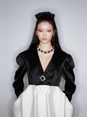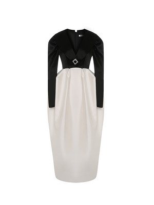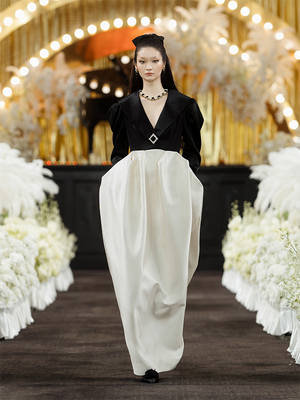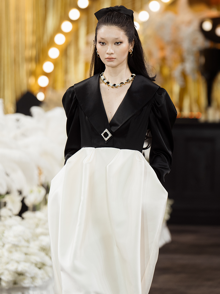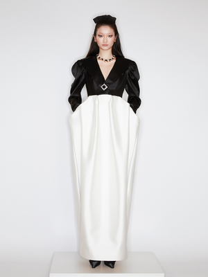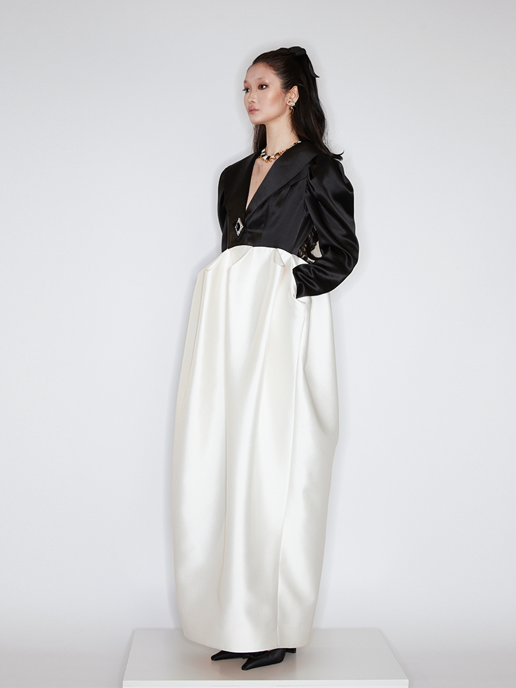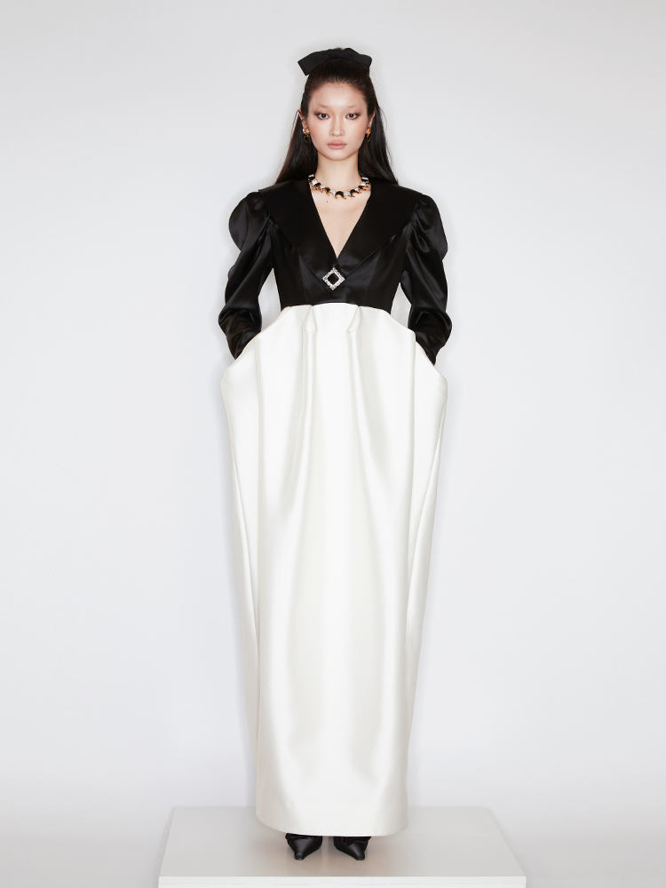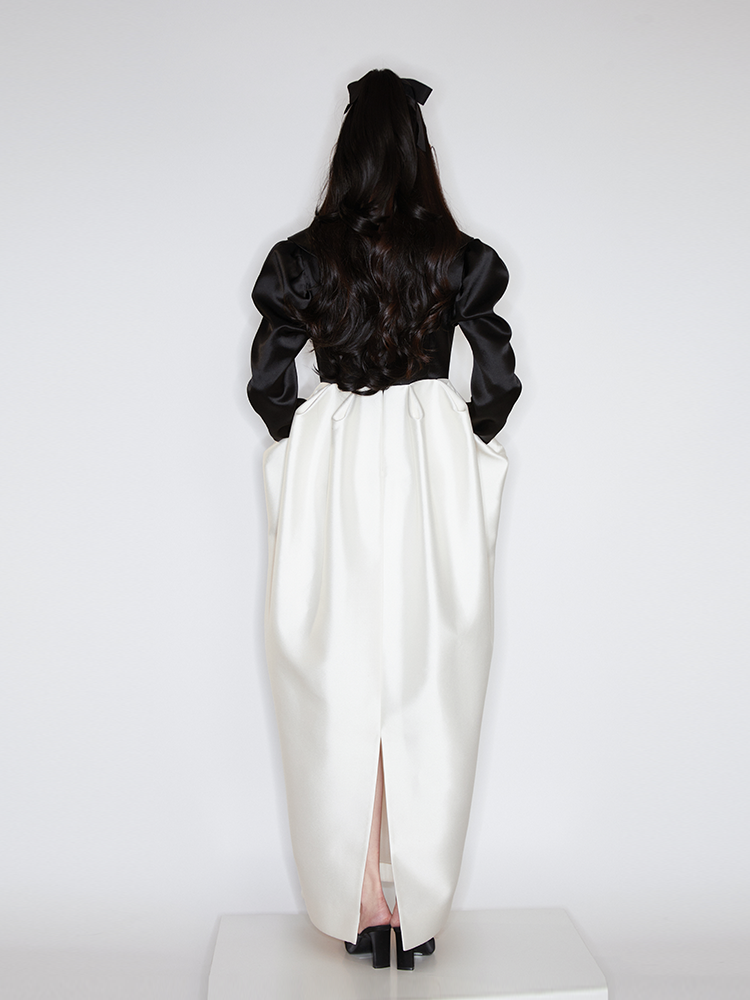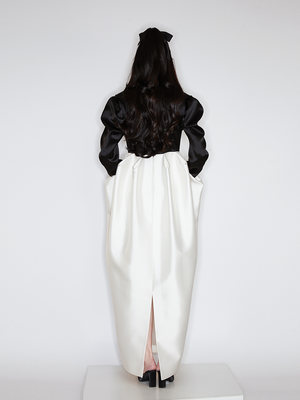 This dress exudes a sense of opera, crafted with a classic black and white stitching. Its high waistline and exaggerated bud hemline create a sophisticated silhouette, ideal for evening wear. Make a personal statement and exude elegance at your next event.
