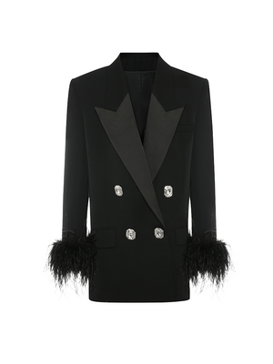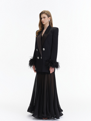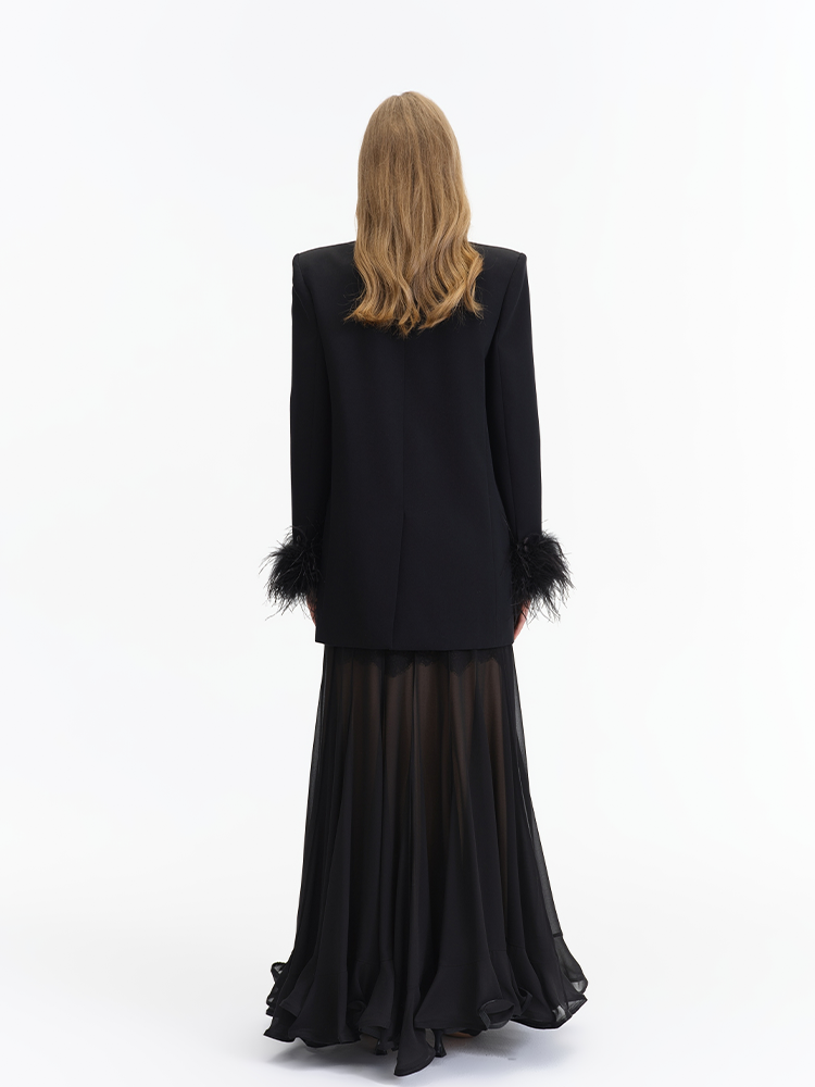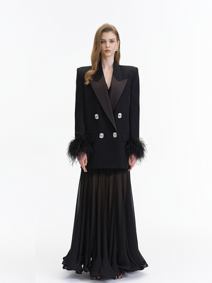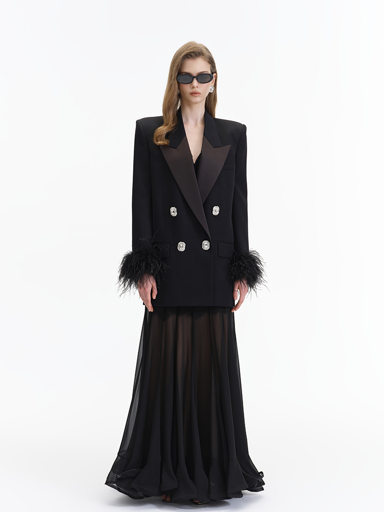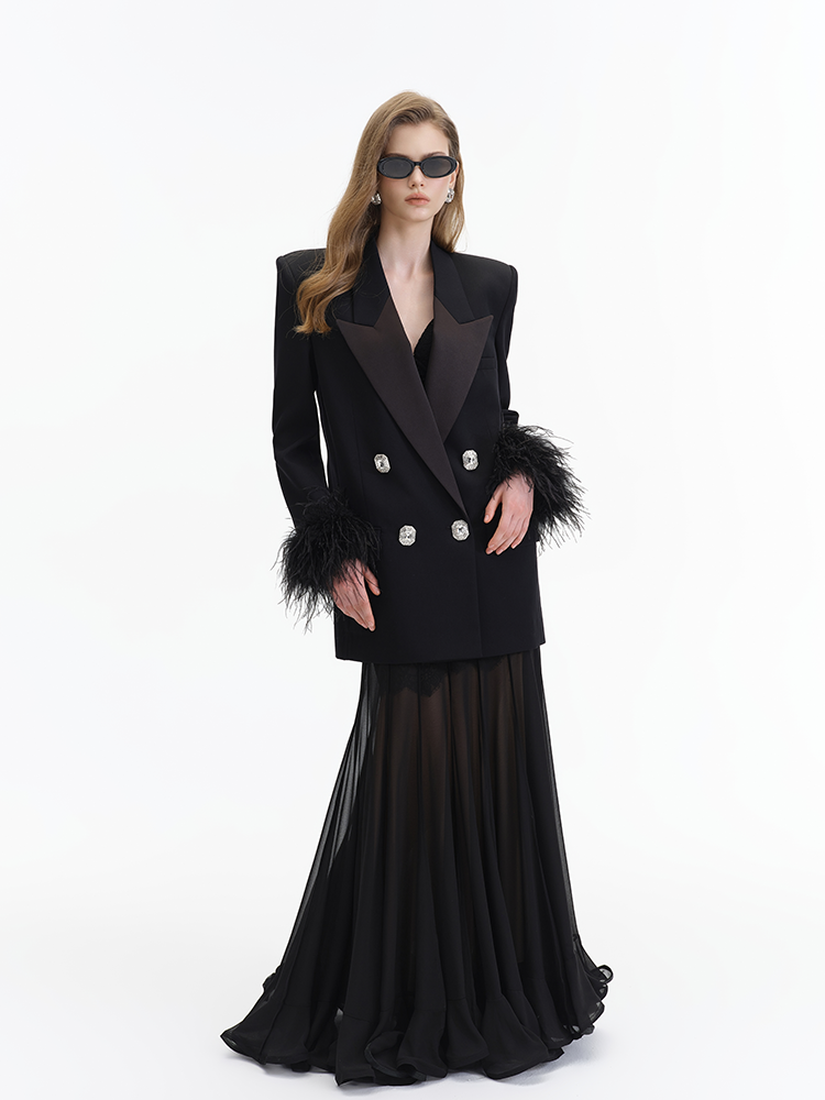 The double breasted design is vintage and elegant, a tribute to the classic suit silhouette, which highlights the wearer’s taste and presence. The shoulder padding enhances the garment’s three dimensional shape, creating a neat and straight shoulder line. The feather decoration at the cuffs is a design highlight—it breaks the seriousness and rigidity of traditional suits, adding a sense of agility and luxury to the overall look.