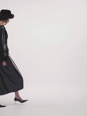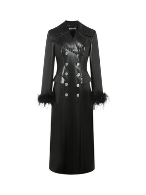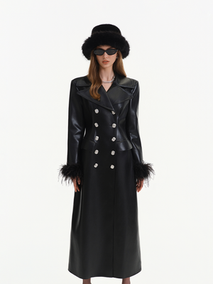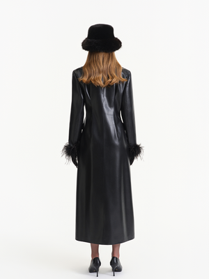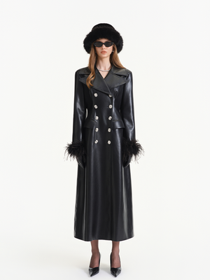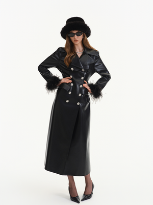 Black Ostrich Feather PU Leather Trench Coat