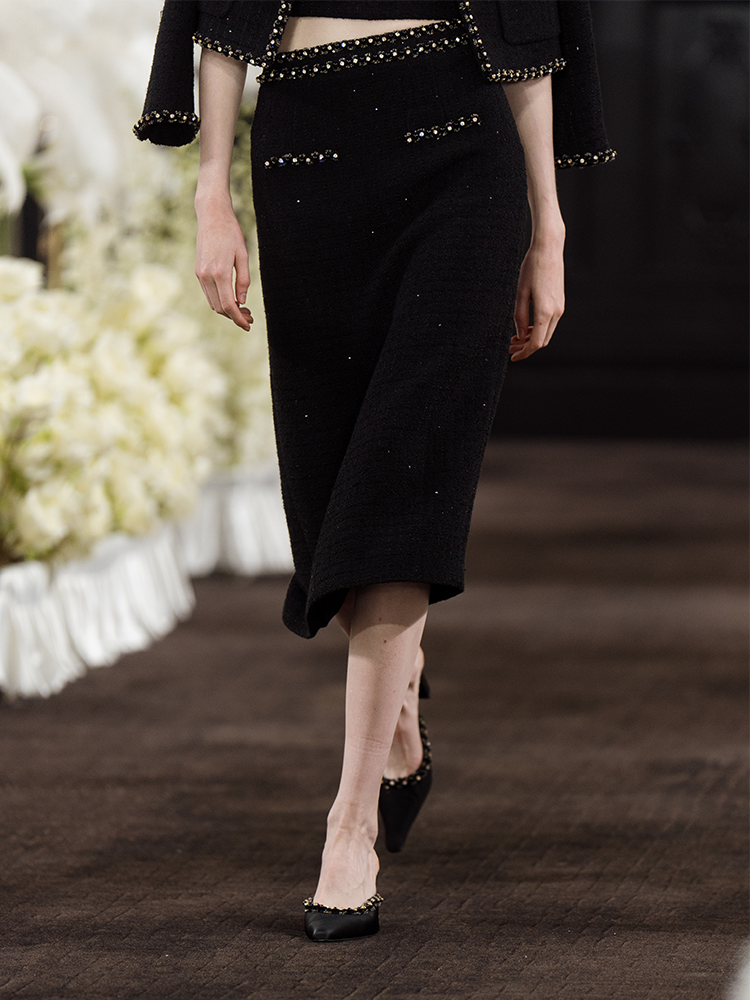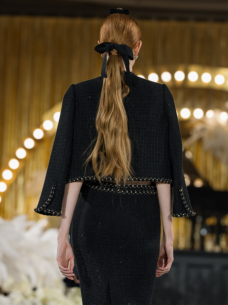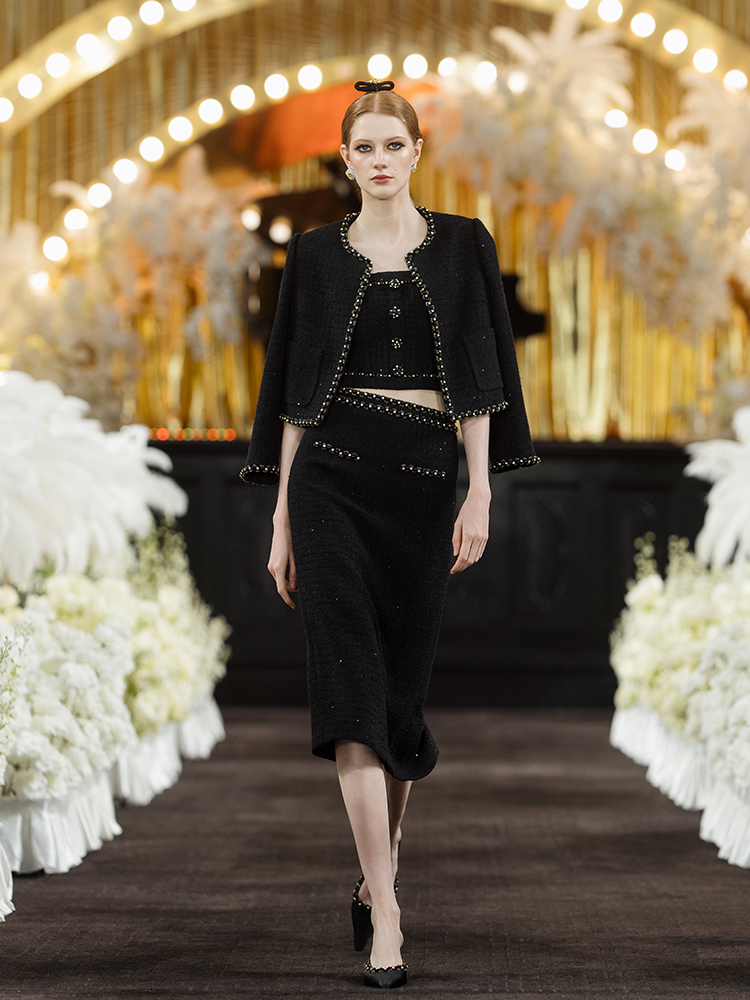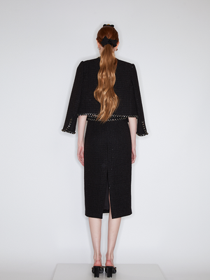 The tweed fabric is infused with glittering sequins for a sophisticated, aristocratic look. The webbing decoration balanced the elegant temperament. Showcase a unique femininity in gentleness.