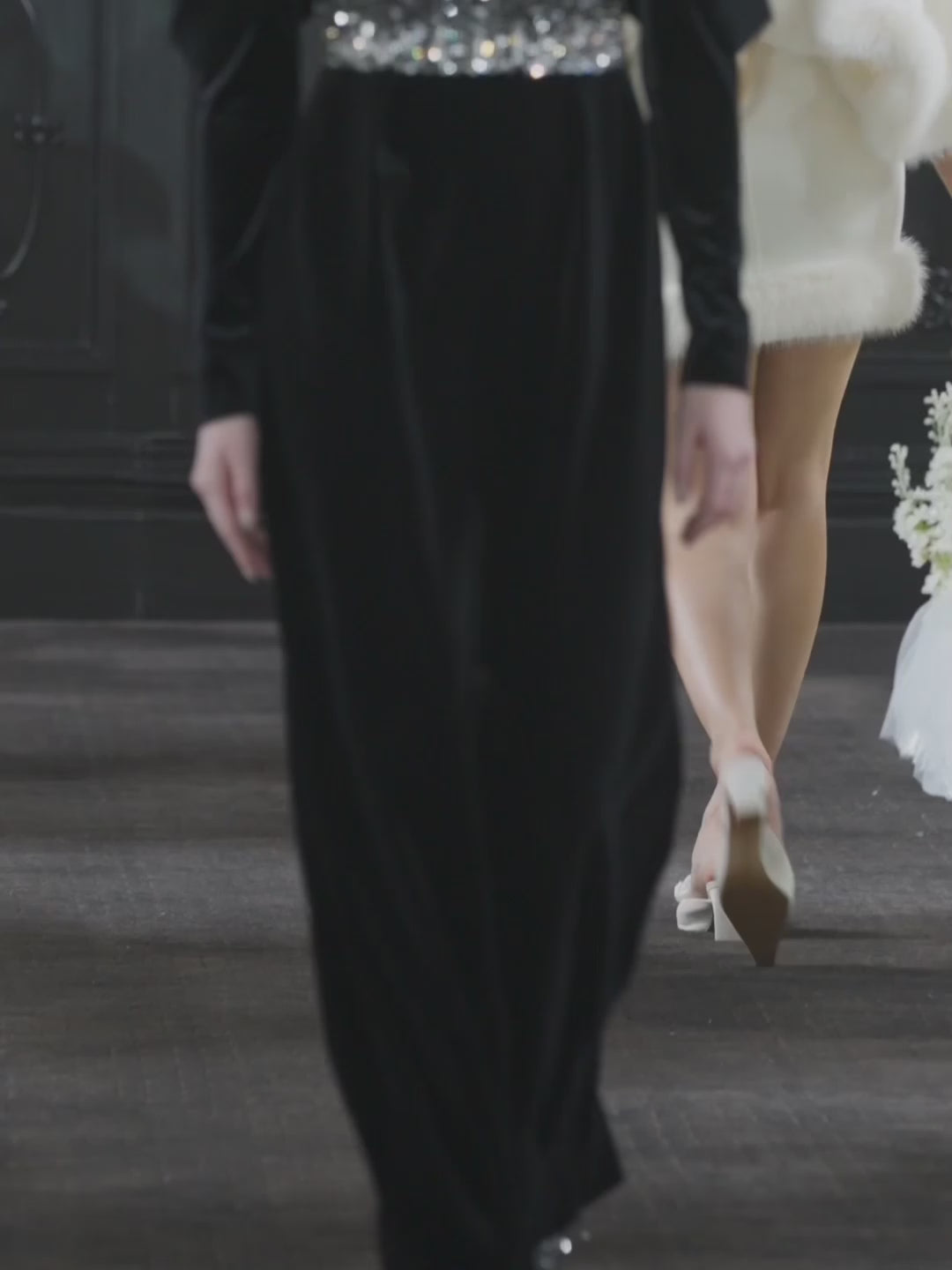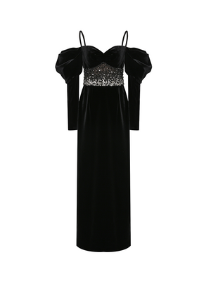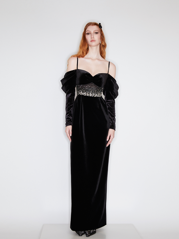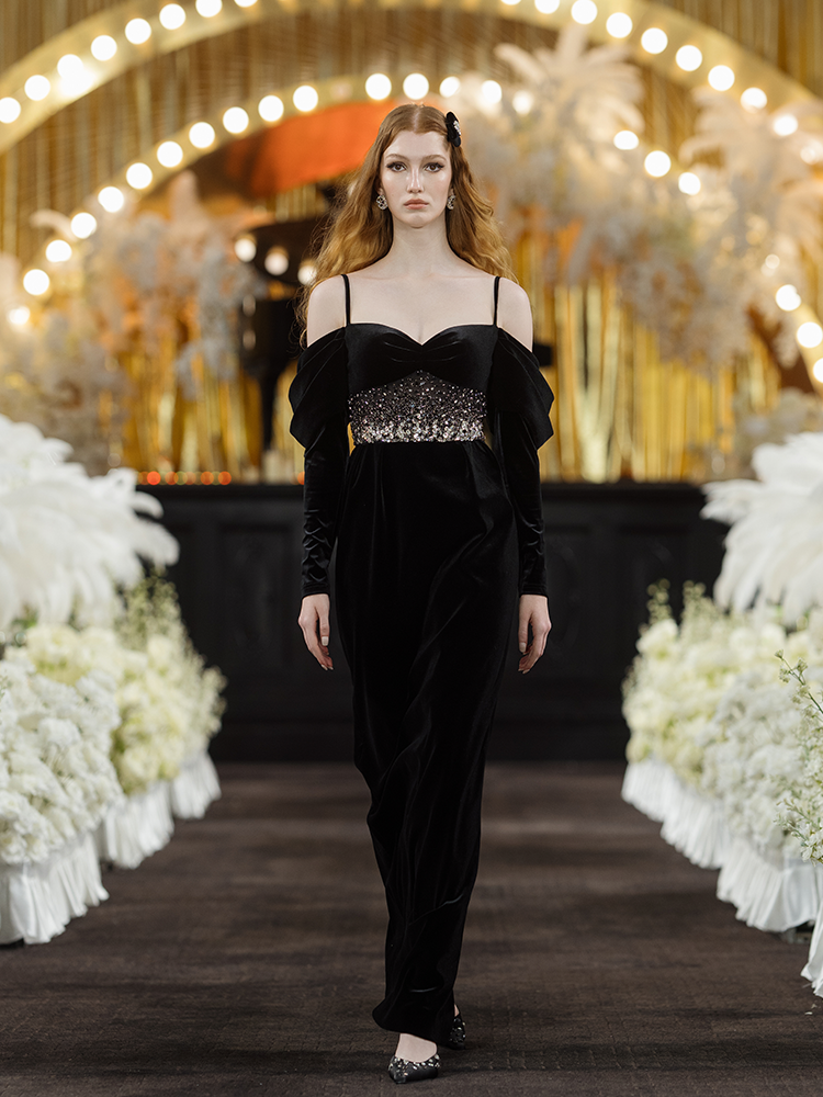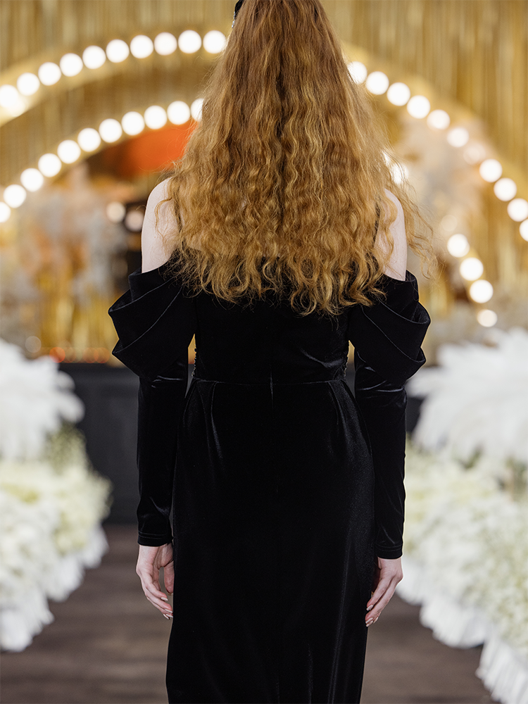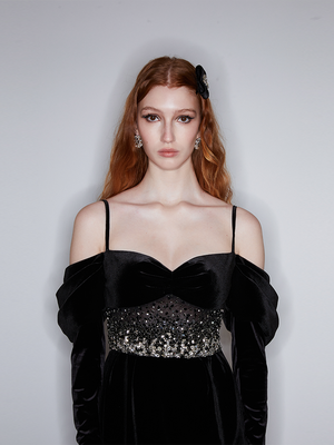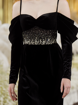 This black dress skirt is made of velvet with a refined luster. A slim-fitting silhouette with premium and luxurious French embroidery craft, creating a glamorous style. The off-shoulder design combined with puffed sleeves for a vintage and elegant look.