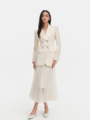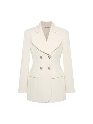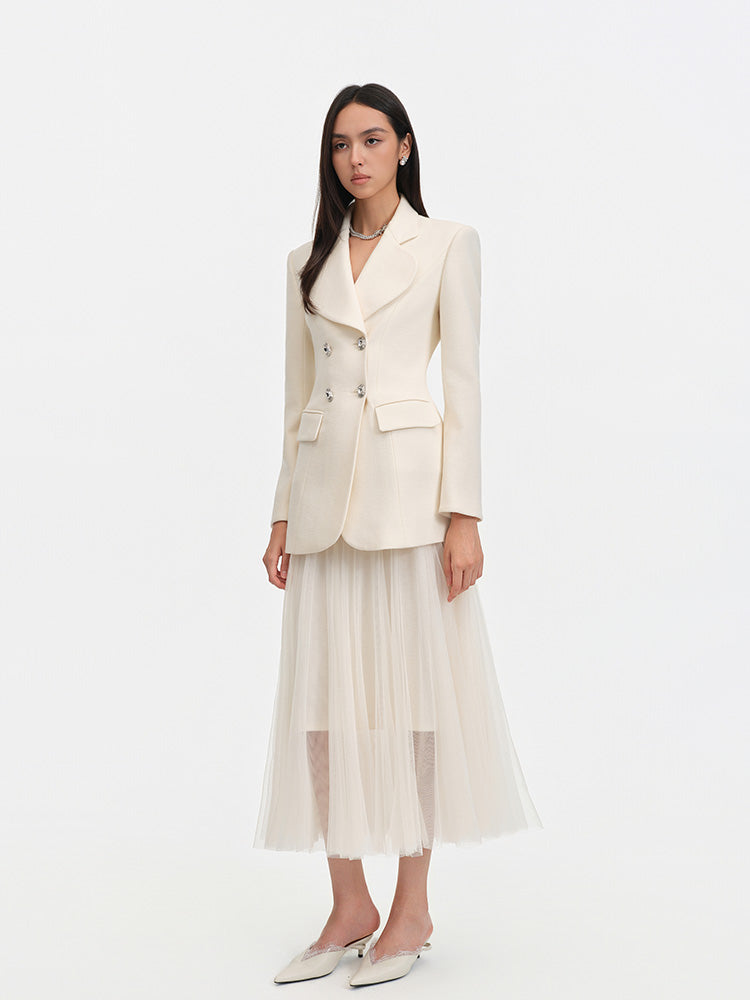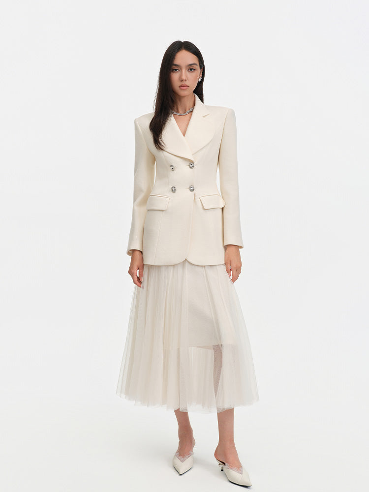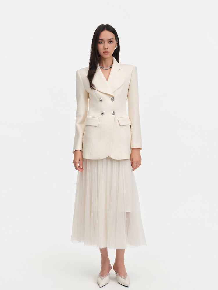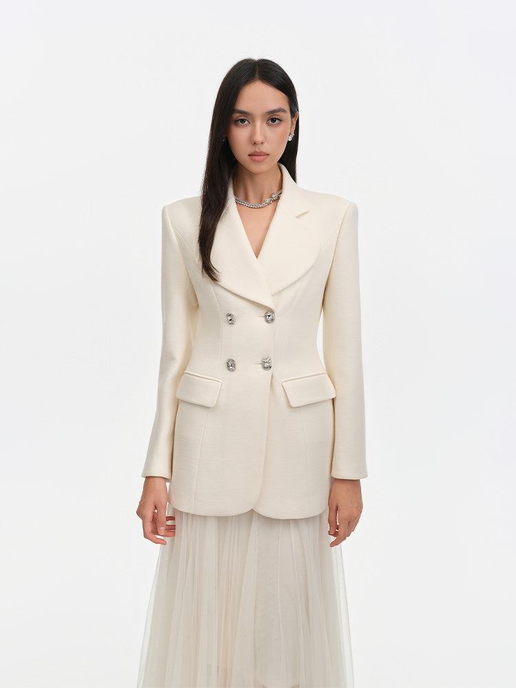 The blazer silhouette is a classic element, exuding a sleek and formal aura. The unique wide lapel design and double row rhinestone button decoration are the standout features: the wide lapels enhance the garment's structural sense and fashion appeal, while the rhinestone buttons add a luxurious and sophisticated ambiance.