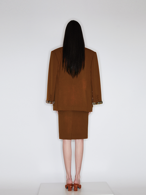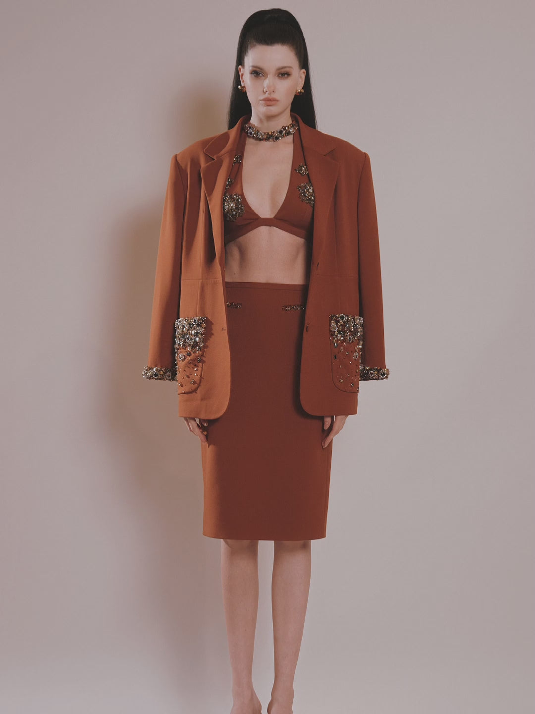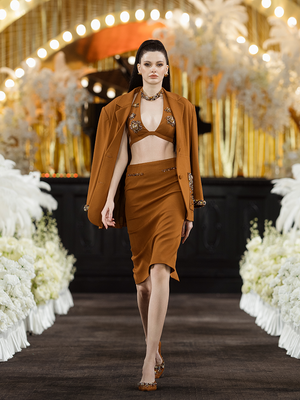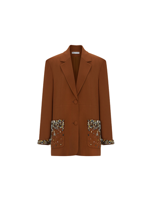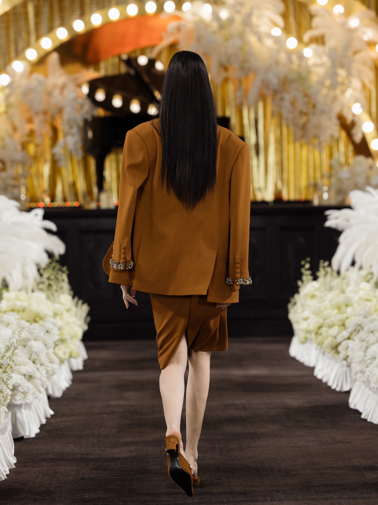 Handcrafted by artisans with over 200 hours of meticulous craftsmanship, the beaded and embroidered suit exudes luxury and nobility from within. The loose fit is a blend of dapper flow and elegant casualness.