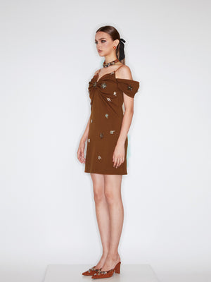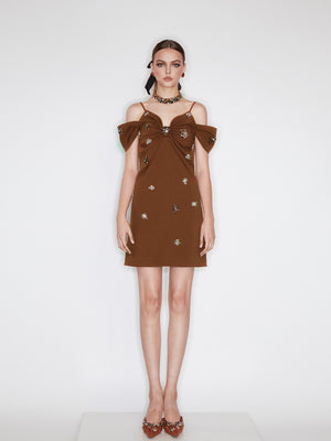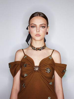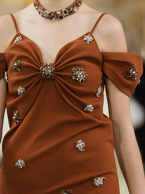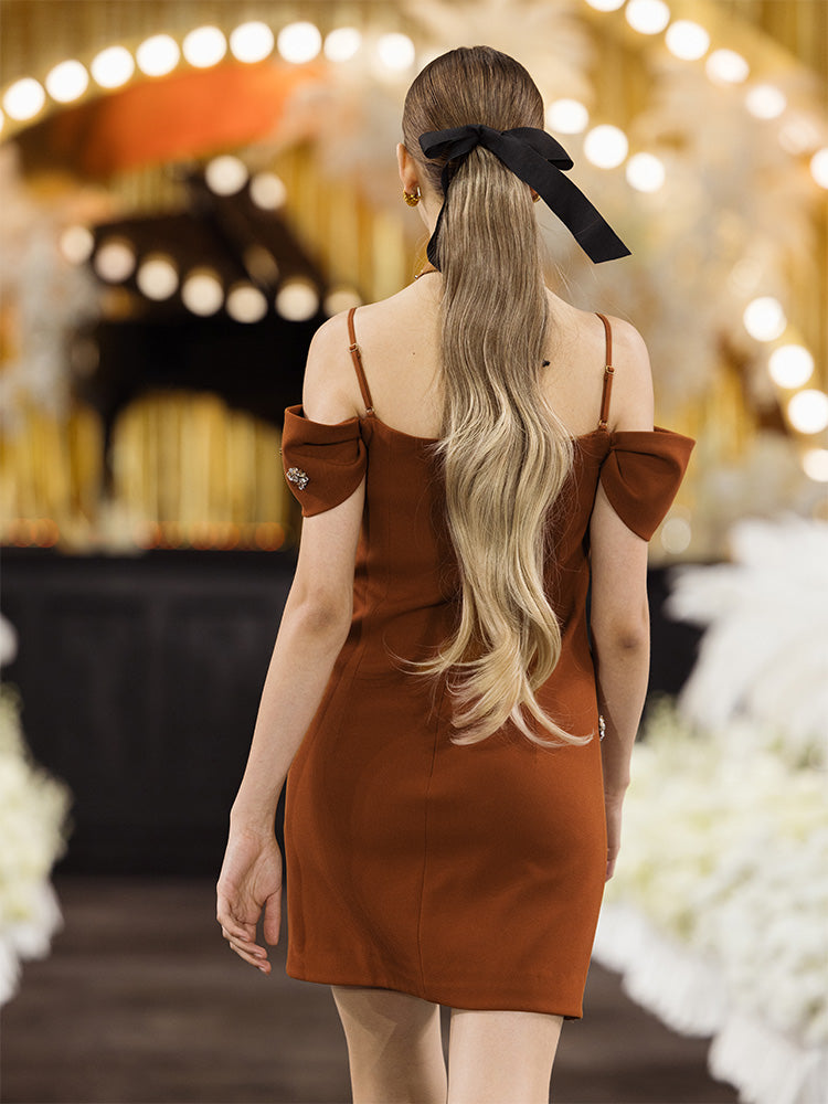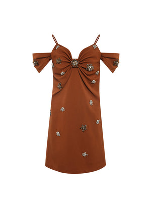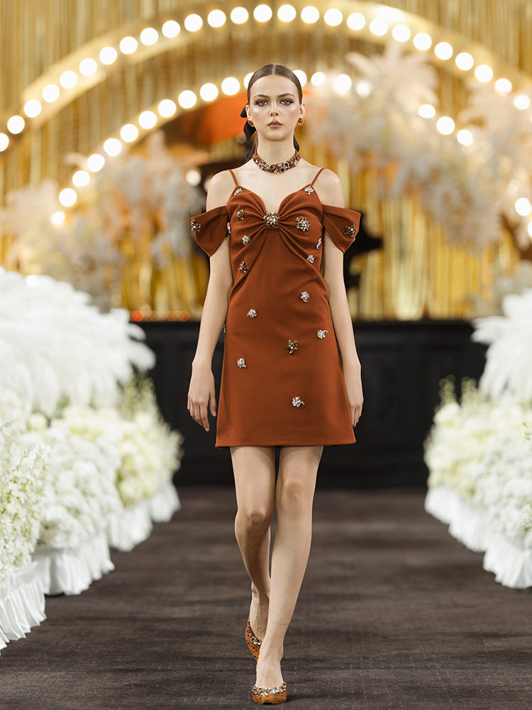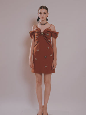 Caramel is a stunning color for fall and winter that makes you glow—delicate hand embroidery beading throughout the dress for a luxurious sparkle. The butterfly-shaped design creates a show-stopping look. This dress is an ideal choice for a party or date.