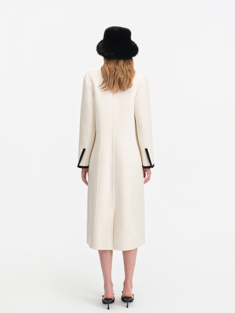 The classic blazer collar paired with black piping adds a touch of refinement to the minimalism.