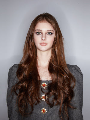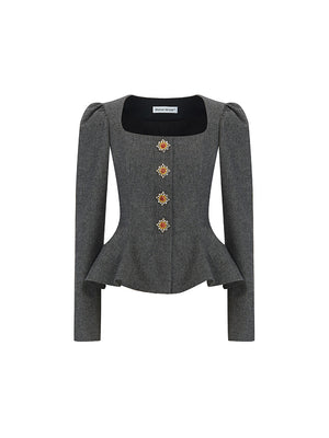 Elaborate square neckline, trimming the neckline. Bubble sleeve design for retro elegance. Carefully tailored wave hemline for a structured and three-dimensional look. Inlaid with gold resin buttons to enhance the overall look. This timeless piece is become a treasured part of your closet.