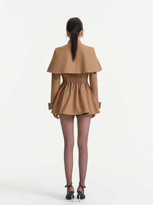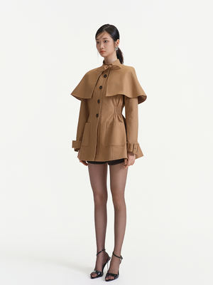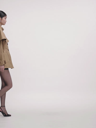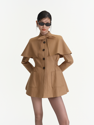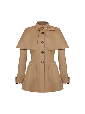 Khaki exudes a temperament of simplicity, grandeur and casualness. The stand up collar paired with a bow design adds a touch of sweetness and delicacy, the cape style shoulder shape is unique and full of a sense of layering.
