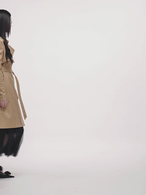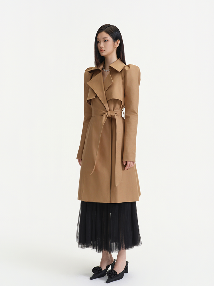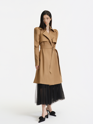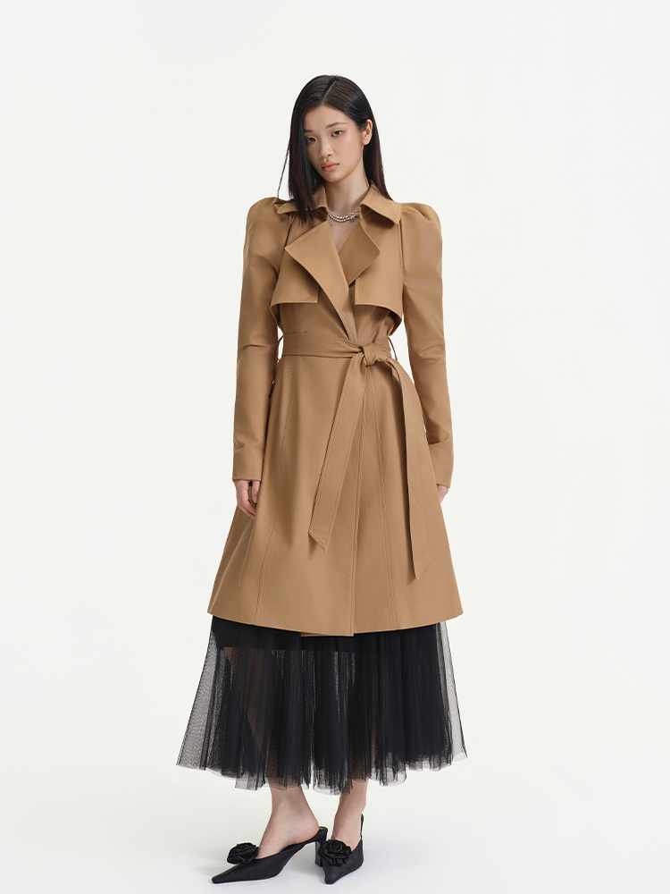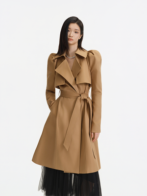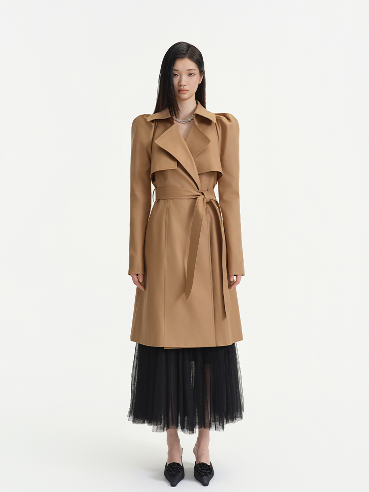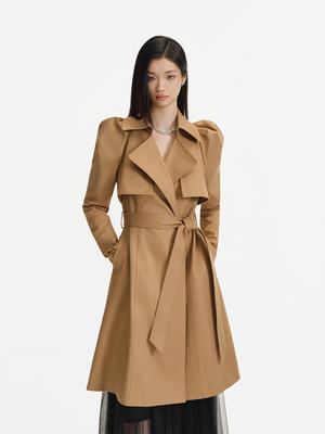 Khaki, a classic hue for trench coats, is paired with timeless design elements like a tailored collar, epaulets, and a waist belt—these traditional trench coat features exude a sleek, sharp style. Meanwhile, the puffed sleeves add a soft, feminine touch to the overall look.