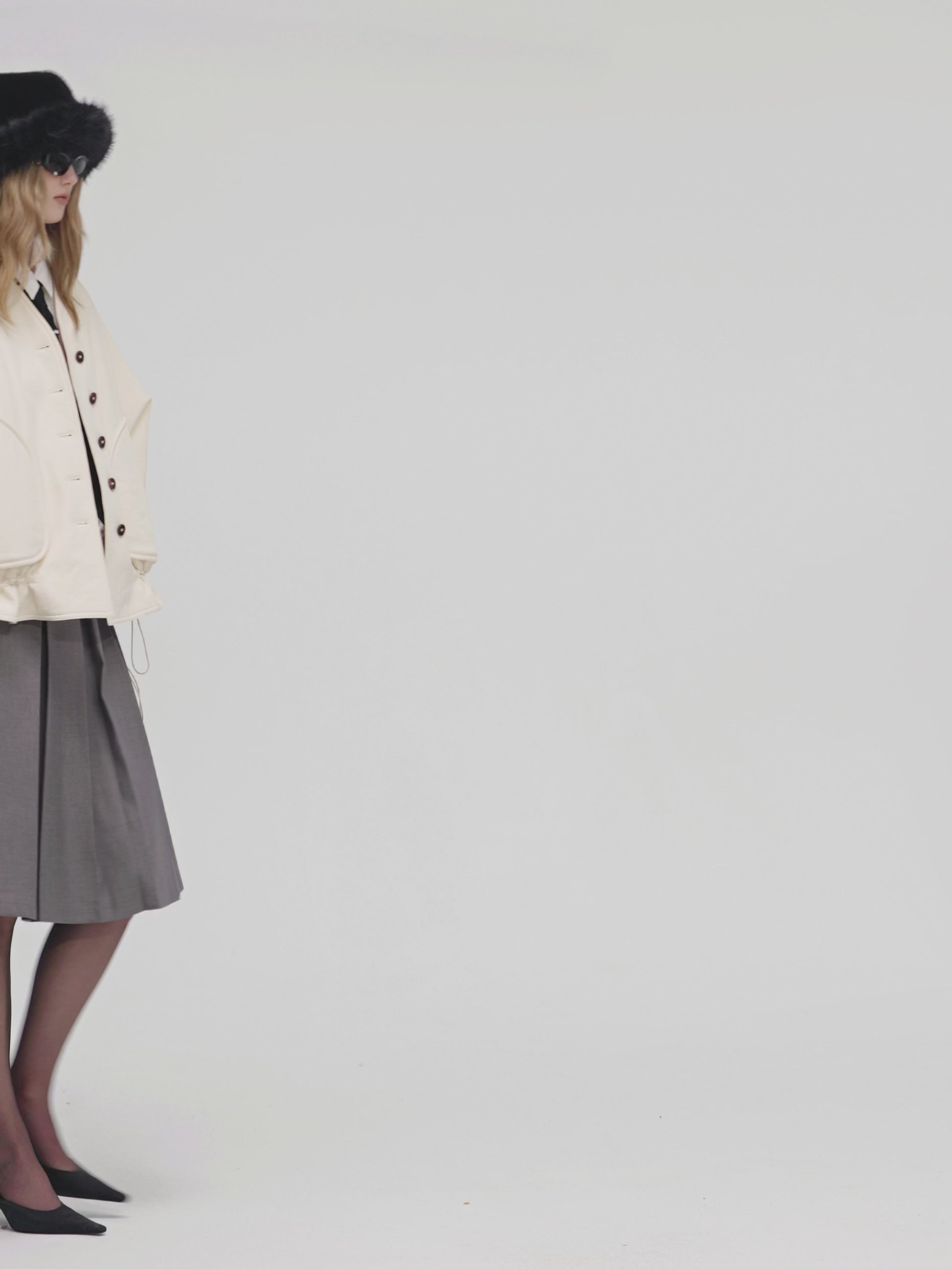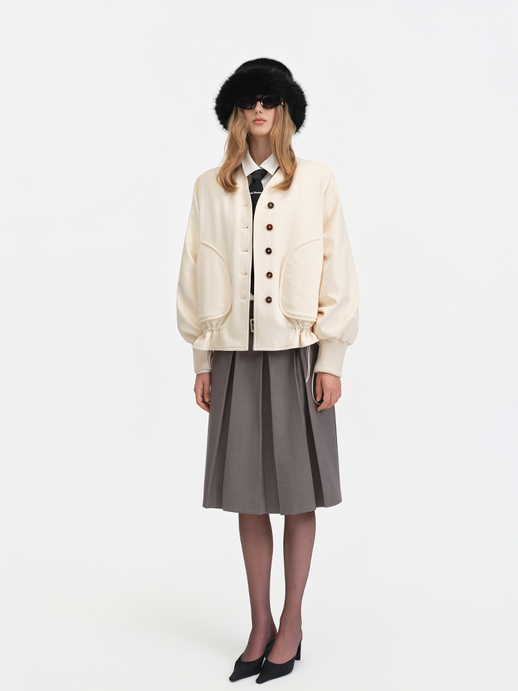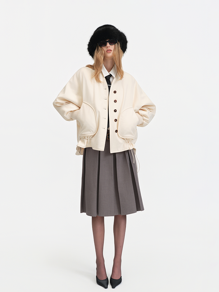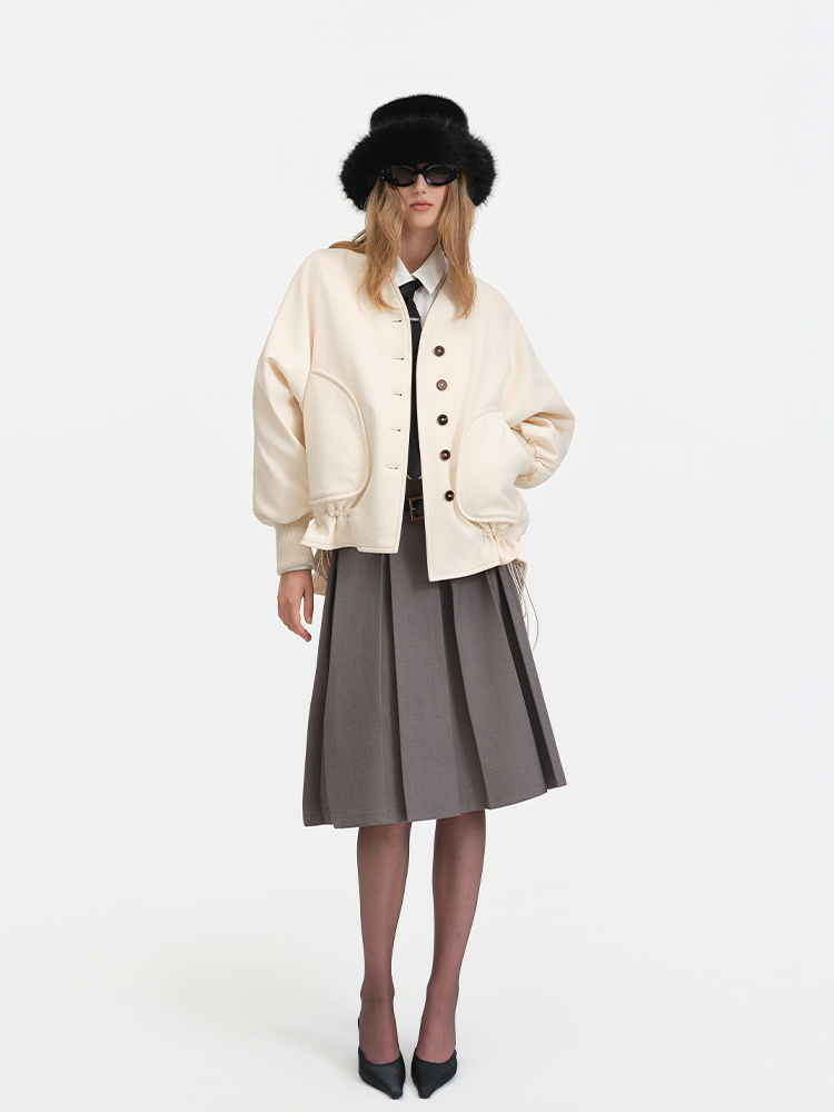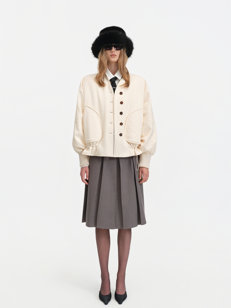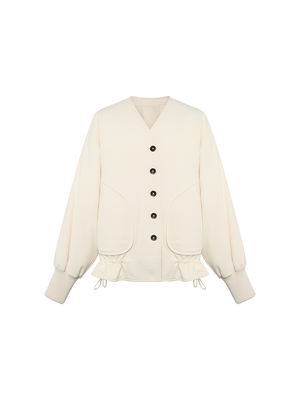 The V-neck design paired with single-breasted fastening retains the jacket’s sleekness and practicality. The large pockets and drawstring hem add a casual vibe and stylistic flair, while the lantern sleeve silhouette infuses the overall look with a touch of sweetness and retro charm.