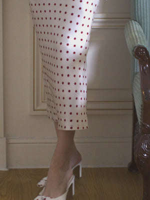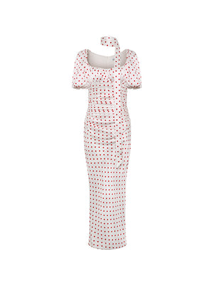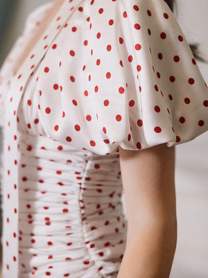 The red polka dot element is retro and timeless. This dress is made of smooth, draped fabric that hugs the body and perfectly accentuates curves. The wide neckline skillfully modifies the neckline. The bubble sleeve design shows elegance and confidence. Mesmerizing.