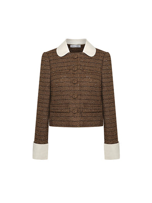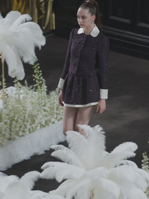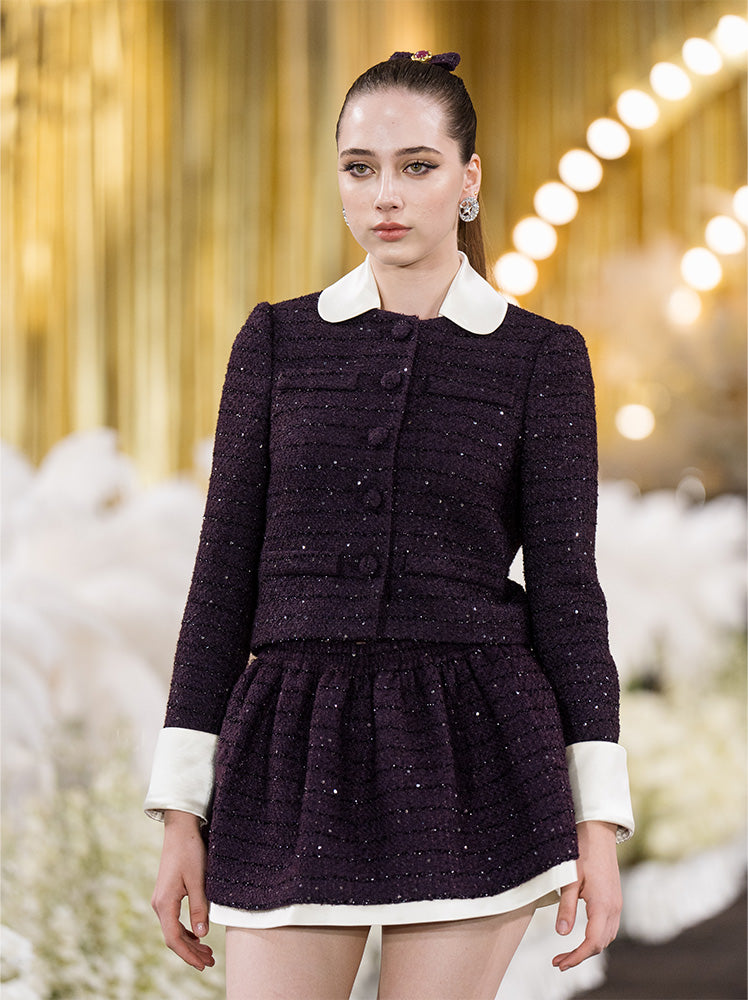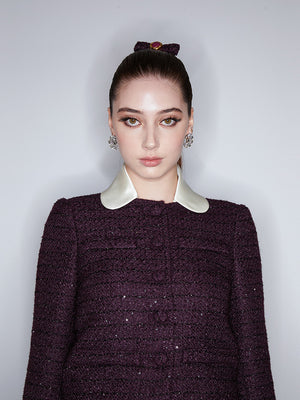 This sequined tweed jacket is suitable for daily wear, party dates, and business occasions, perfect for the fall and winter. The white silk collar embellishment reveals a sense of nobility and elegance.