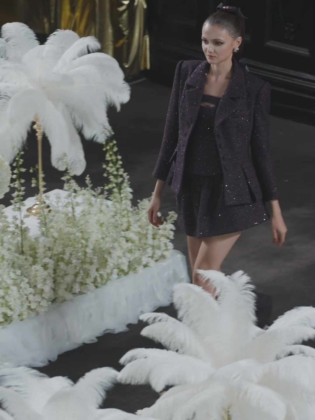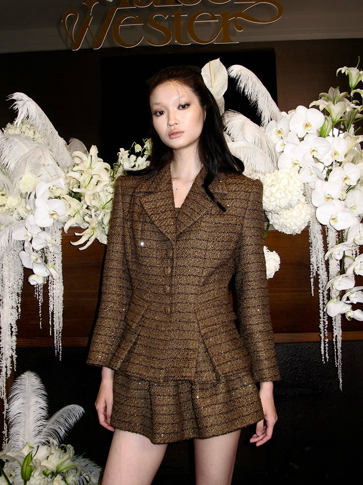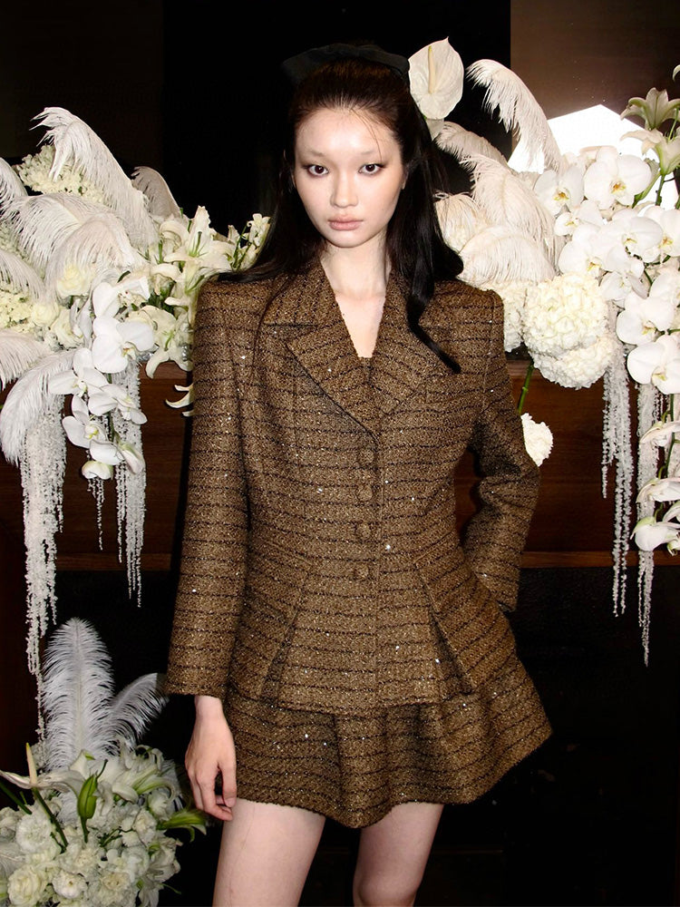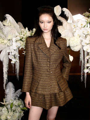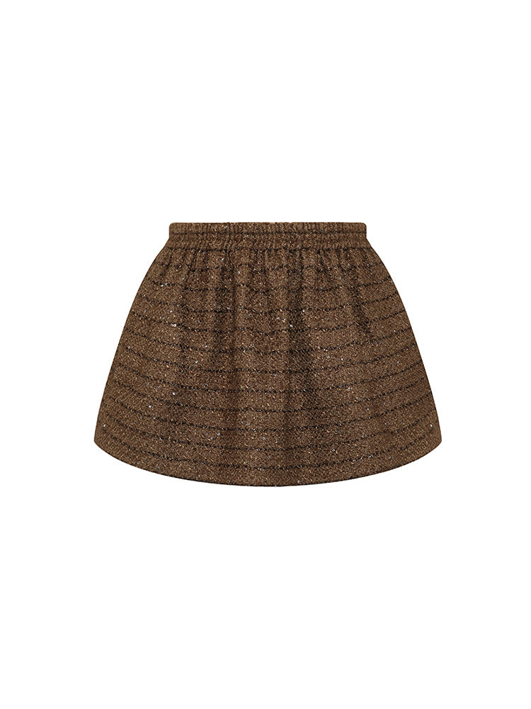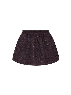 This mini skirt is made of sequined tweed fabric, a versatile fashion item for fall and winter. With a sense of high class, it is retro and playful. This skirt is one-half of an ensemble suitable for a special occasion. To enhance the overall effect, pair it with a pair of our statement earrings.