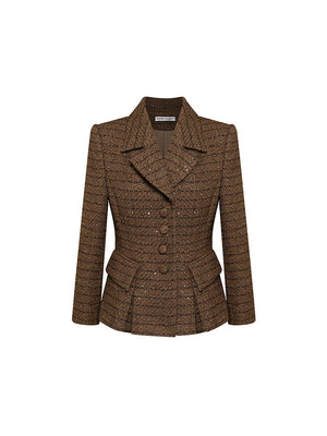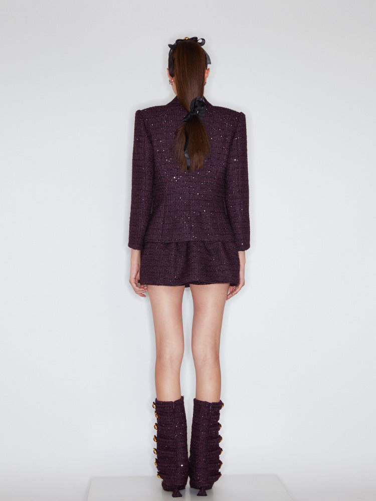 With a noble and elegant color, the purple lapel suit comes with a classic and timeless charm. This jacket is made of tweed fabric. Sequin elements blend sophistication with comfort. The cinched waist design with exposed pockets emphasizes the sense of structure. A must-have for your fall and winter closet.