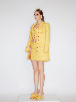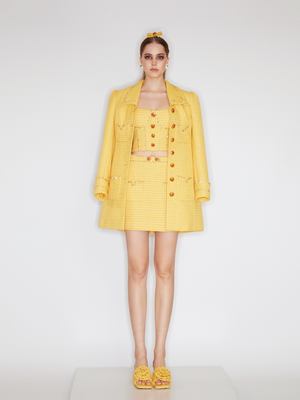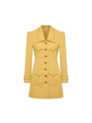 Textured tweed yellow dress — featured with rhinestone detailing — sophisticated and elegant for everyday ease. For desk-to-dinner chic, pair it with earrings.