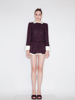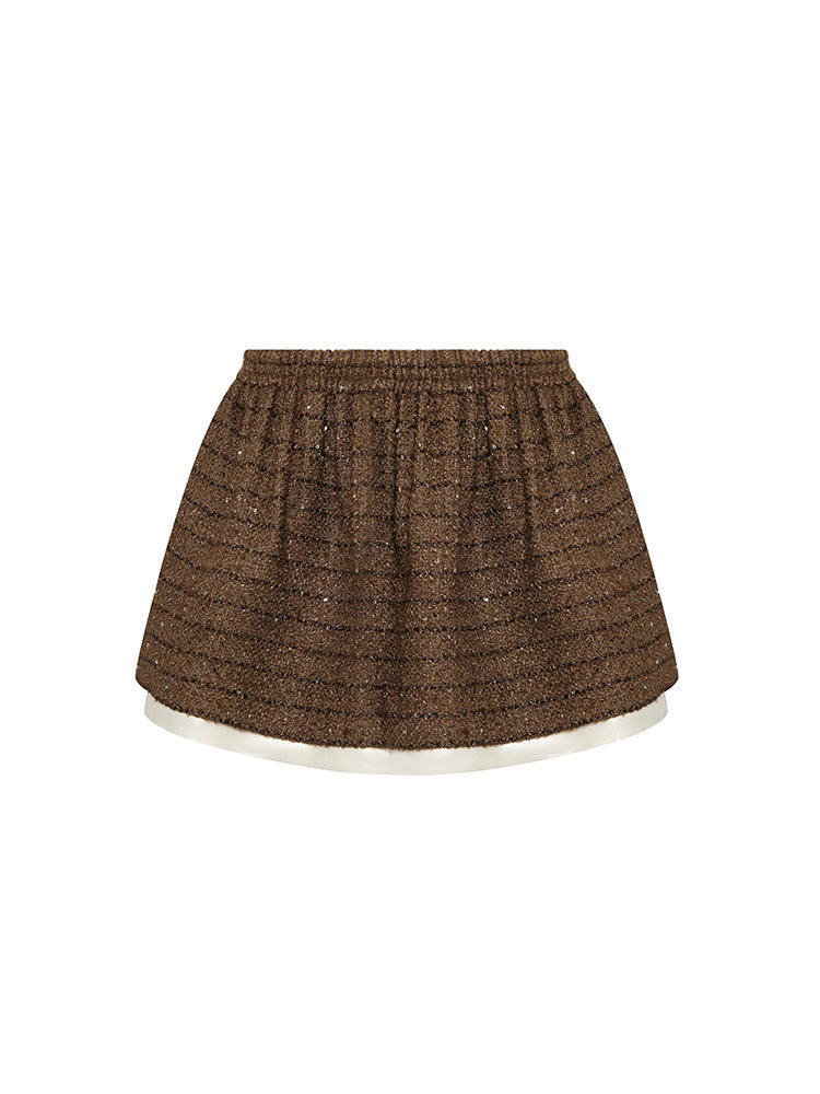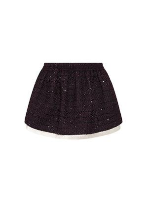 This sequin tweed skirt is retro and playful. The skirt is spliced with mulberry silk, adding a sense of sophistication. It is a casual and versatile piece.