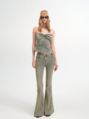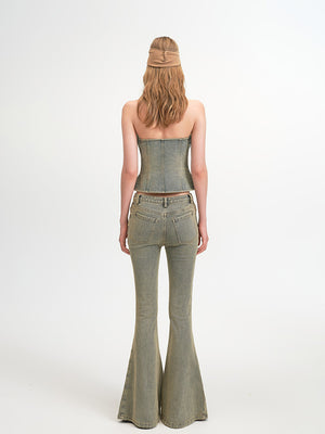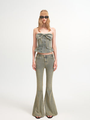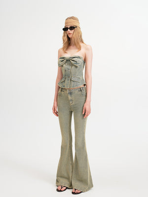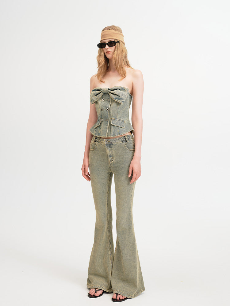 Vintage Distressed Bow Accentuated Denim Strapless Top