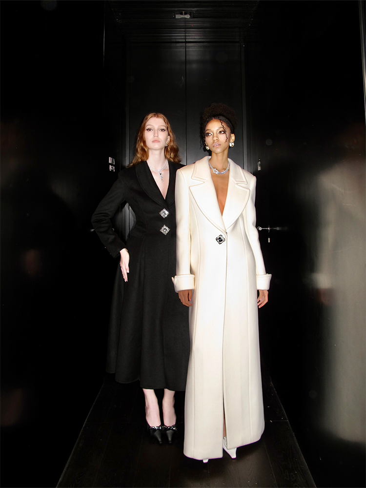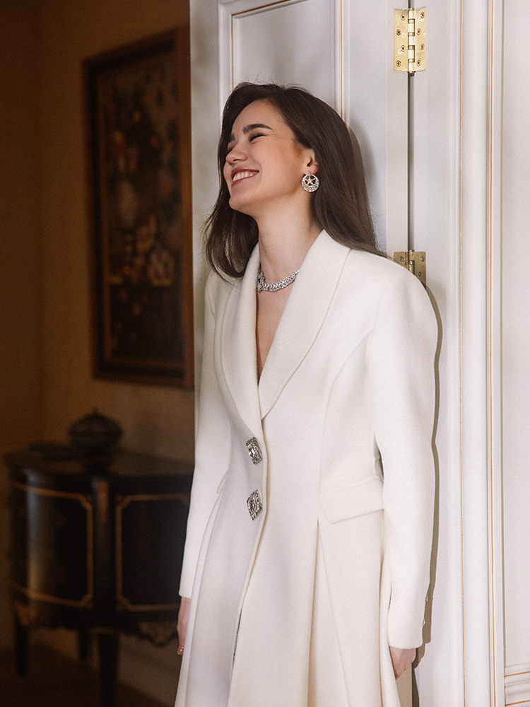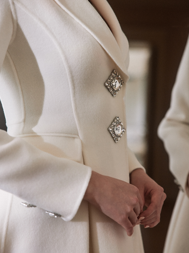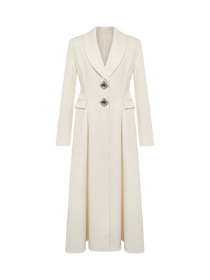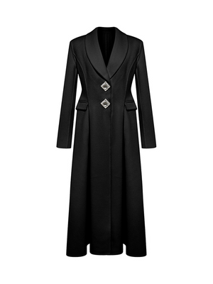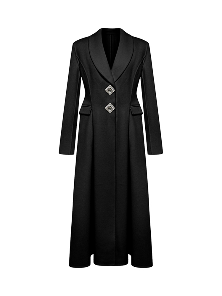 This wool coat provides warmth and comfort, combining practicality with a touch of luxury and elegance. This coat is made of pure wool material. Its nobility comes from the rounded lapel, and slim fit. Exquisite rhinestone buttons embellish the waist.